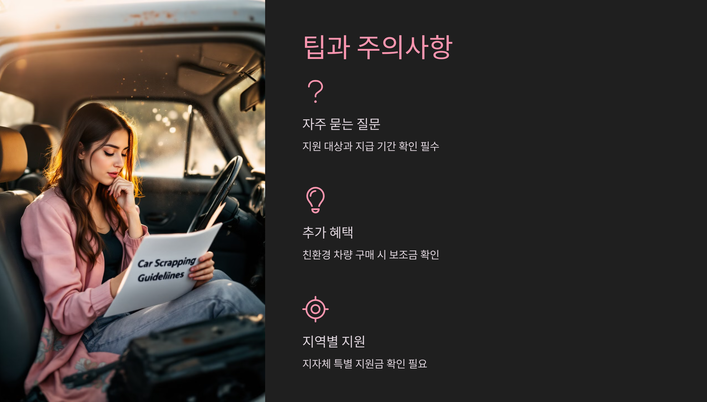 - 폐차 후에는 신차 구매 또는 대체 차량을 등록해야 추가 지원금을 받을 수 있습니다. 대체 차량은 친환경 차량이 아니더라도 보조금을 받을 수 있지만, 전기차 또는 수소차 구매 시 혜택이 더 큽니다.
