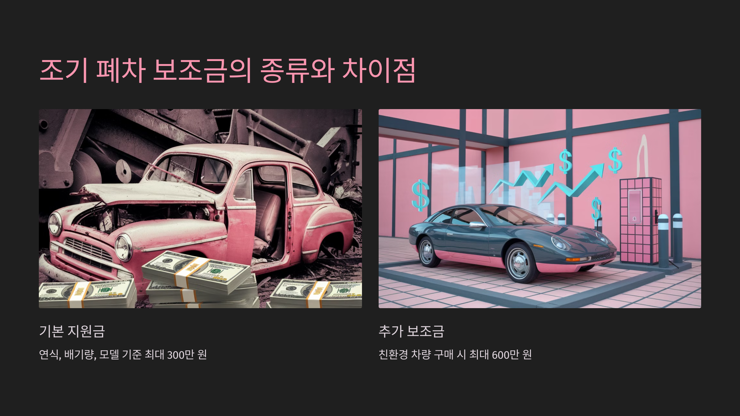 - 차량의 연식, 배기량, 모델 등을 기준으로 책정됩니다. 일반적으로 오래된 차량일수록 지원금이 높아집니다.