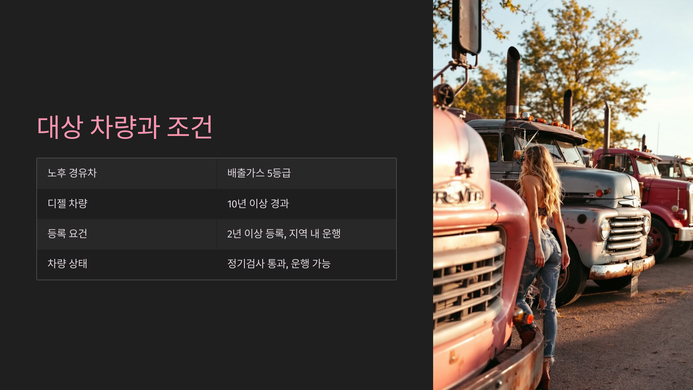 아니요. 지원 대상 차량은 정부가 정한 조건을 충족해야 합니다. 배출가스 등급과 등록 기간 등 기준이 엄격히 적용됩니다. - 지원금은 바로 지급되나요?
