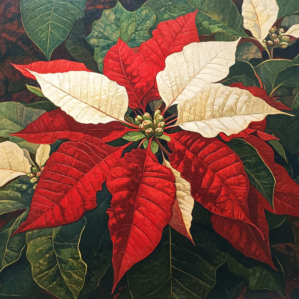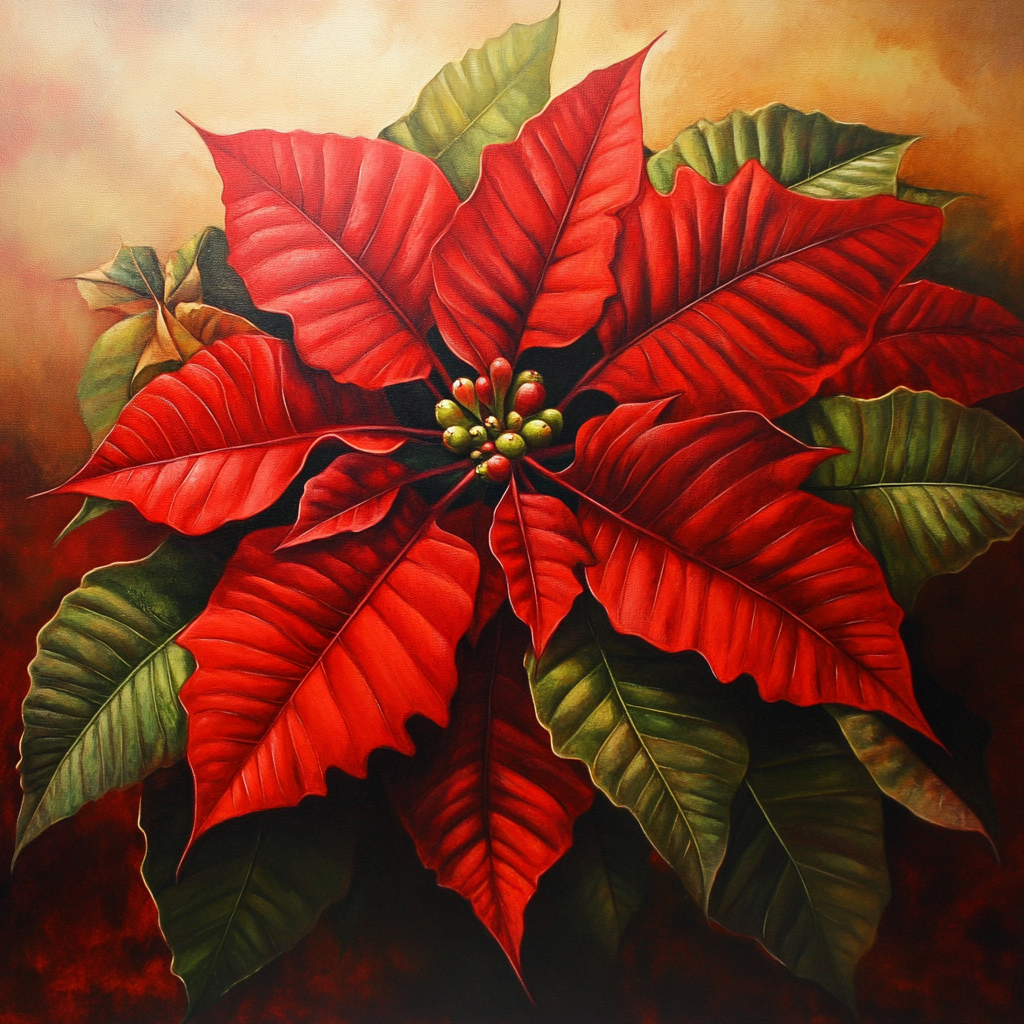 포인세티아는 붉은 잎사귀와 연한 크림색 꽃 같은 부분이 특징적입니다. 사실 이 붉은 부분은 꽃이 아니라 잎이 변형된 형태로, 식물학적으로는 포엽이라고 합니다.