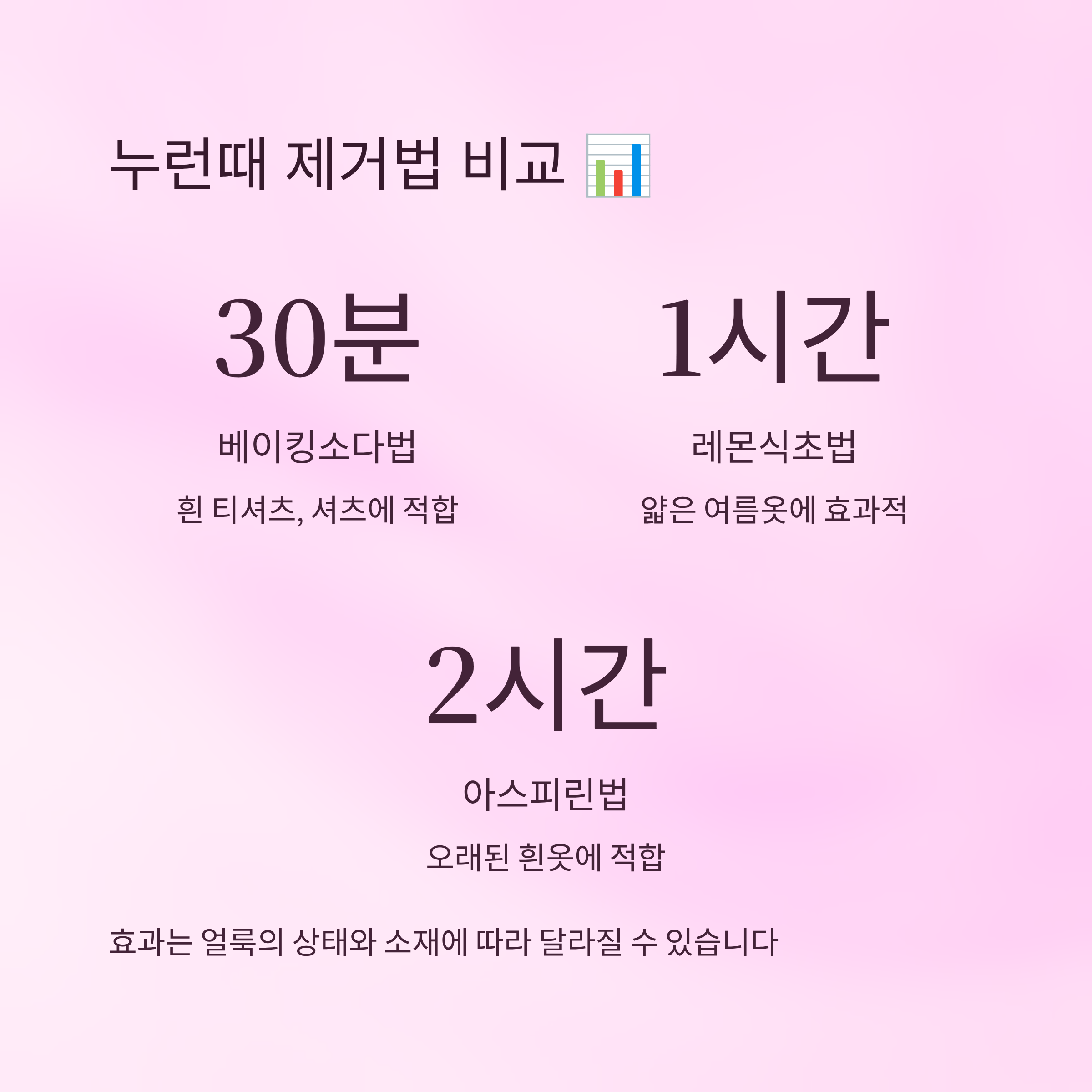 | 레몬식초법 | 레몬즙 + 식초 | 30분~1시간 | 얇은 여름옷 | 컬러 옷 금지 |
