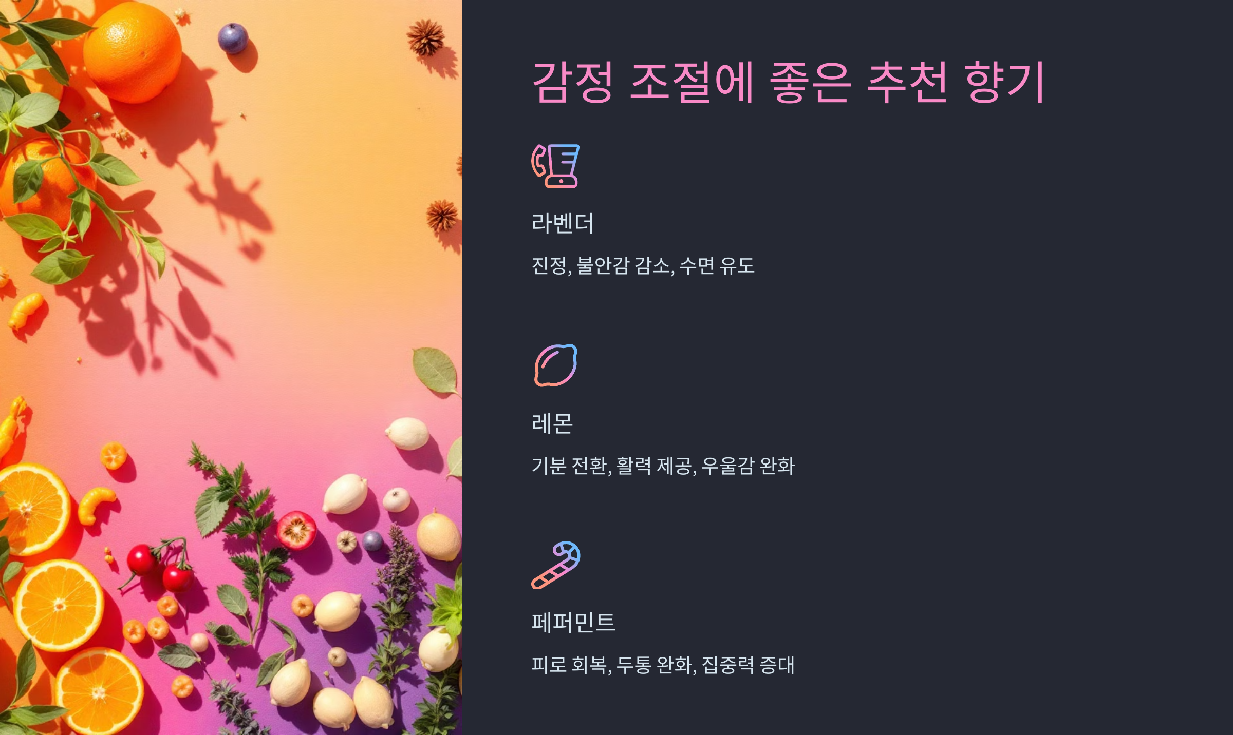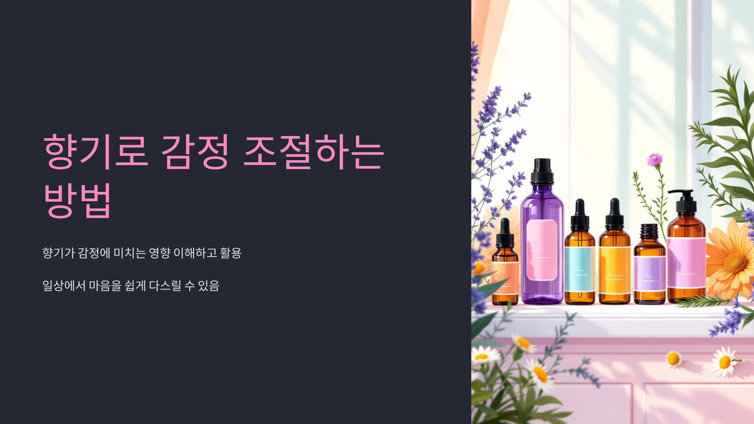 향기는 우리의 감정을 빠르게 조절하는 강력한 도구입니다. 각기 다른 향기의 감정 효과를 이해하고 활용하면 일상 속에서 마음의 평화를 쉽게 찾을 수 있습니다. 자신에게 맞는 힐링 향기를 찾아 매일의 감정을 조절해보세요. 행복하고 편안한 하루를 만들어 줄 향기를 즐기며 감정 조절을 시도해보세요.