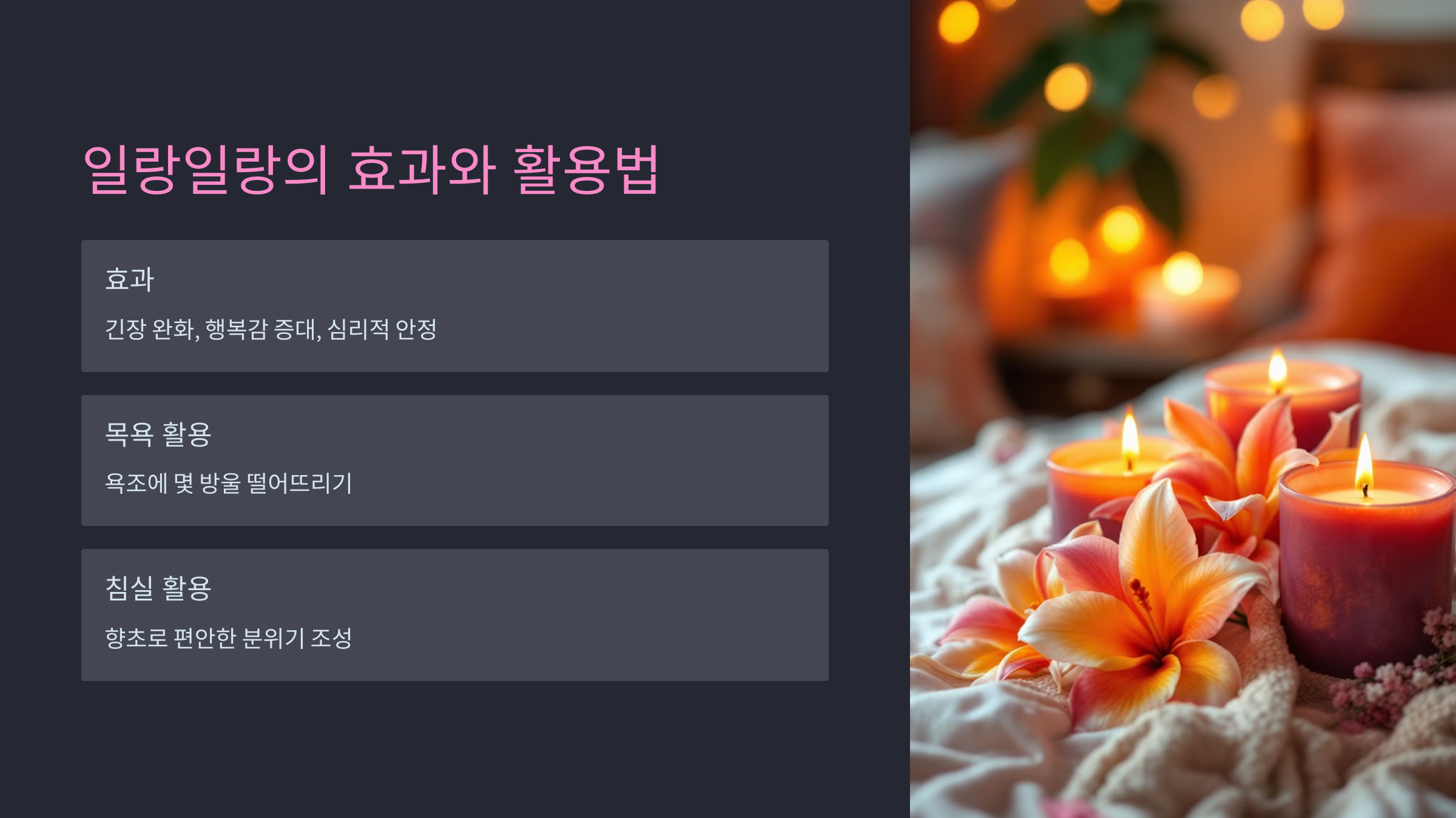 - 활용법: 저녁에 일랑일랑이나 샌달우드 향초를 사용해 긴장감을 풀고 휴식 시간을 즐기세요. 심리적 안정과 숙면에 좋은 효과가 있습니다.