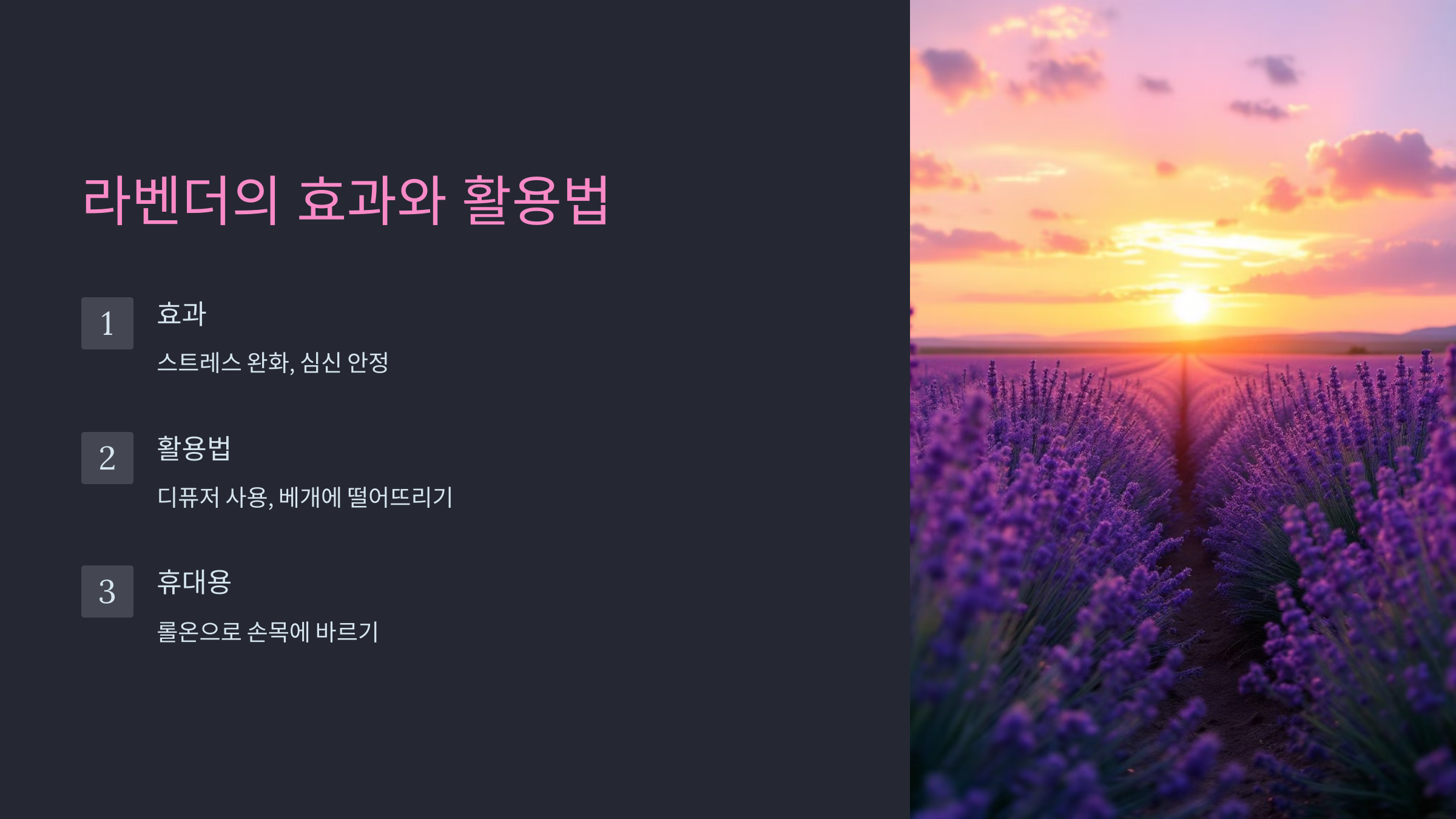 라벤더는 스트레스 완화와 심신 안정에 탁월한 효과가 있어 불안하거나 긴장될 때 큰 도움을 줍니다.