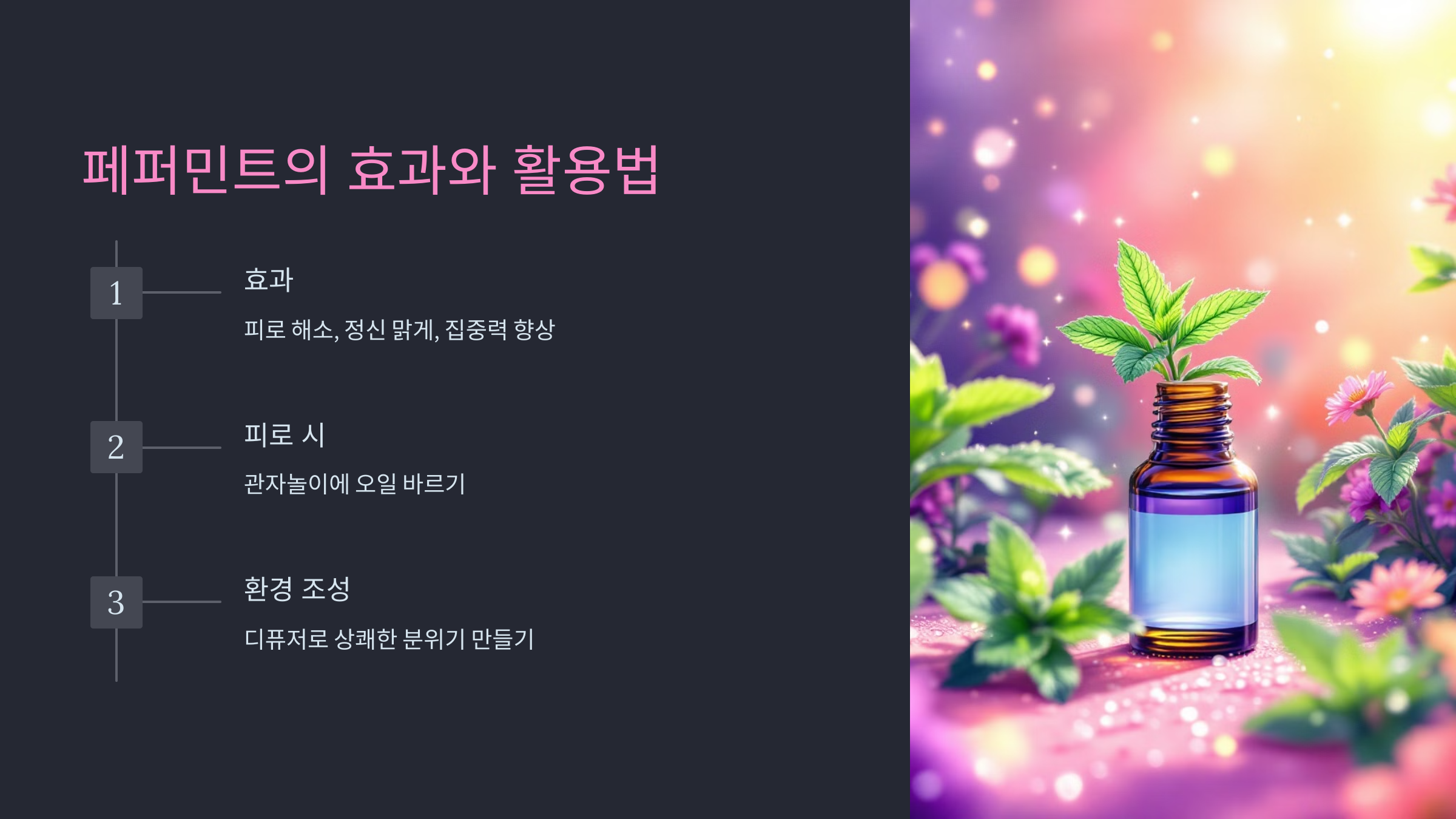- 활용법: 피로를 느낄 때 관자놀이에 페퍼민트 오일을 소량 바르거나, 디퓨저로 상쾌한 환경을 조성하세요. 휴대용 롤온 오일로도 간편하게 사용할 수 있습니다.