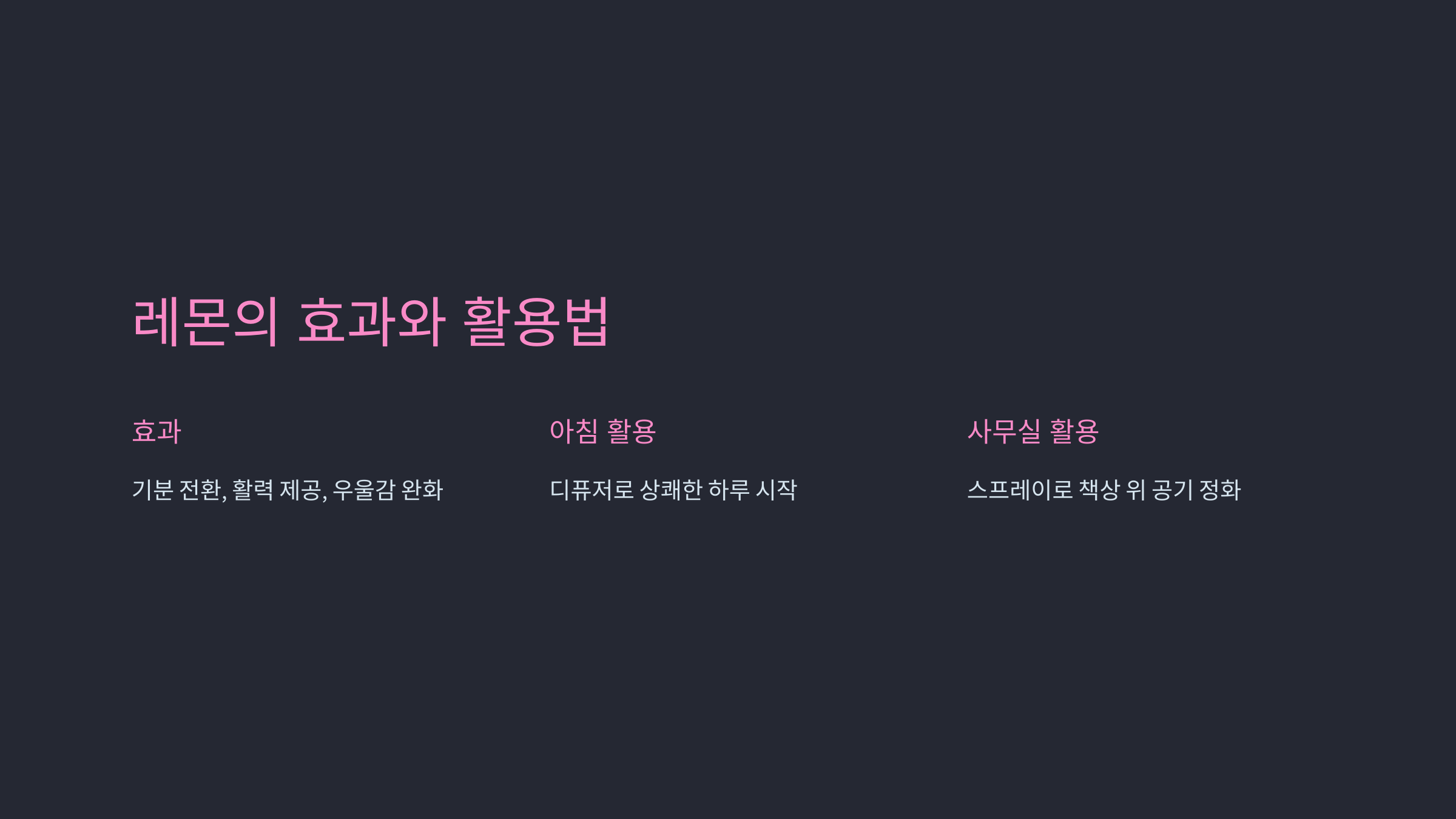 레몬은 상쾌한 향으로 기분을 전환시키고, 활력을 불어넣어 줍니다. 우울하거나 피곤할 때 레몬 향은 기운을 북돋아줍니다.