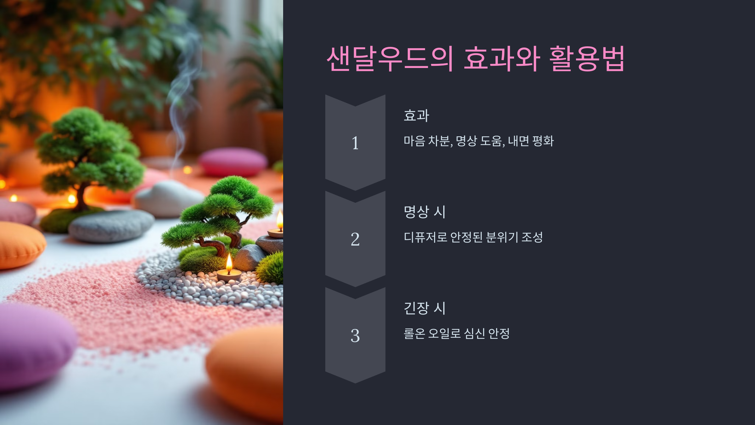 - 활용법: 명상이나 요가 시간에 샌달우드 향을 디퓨저로 사용해보세요. 긴장이 많이 될 때 휴대용 롤온 오일을 사용해 심신의 안정을 찾을 수 있습니다.