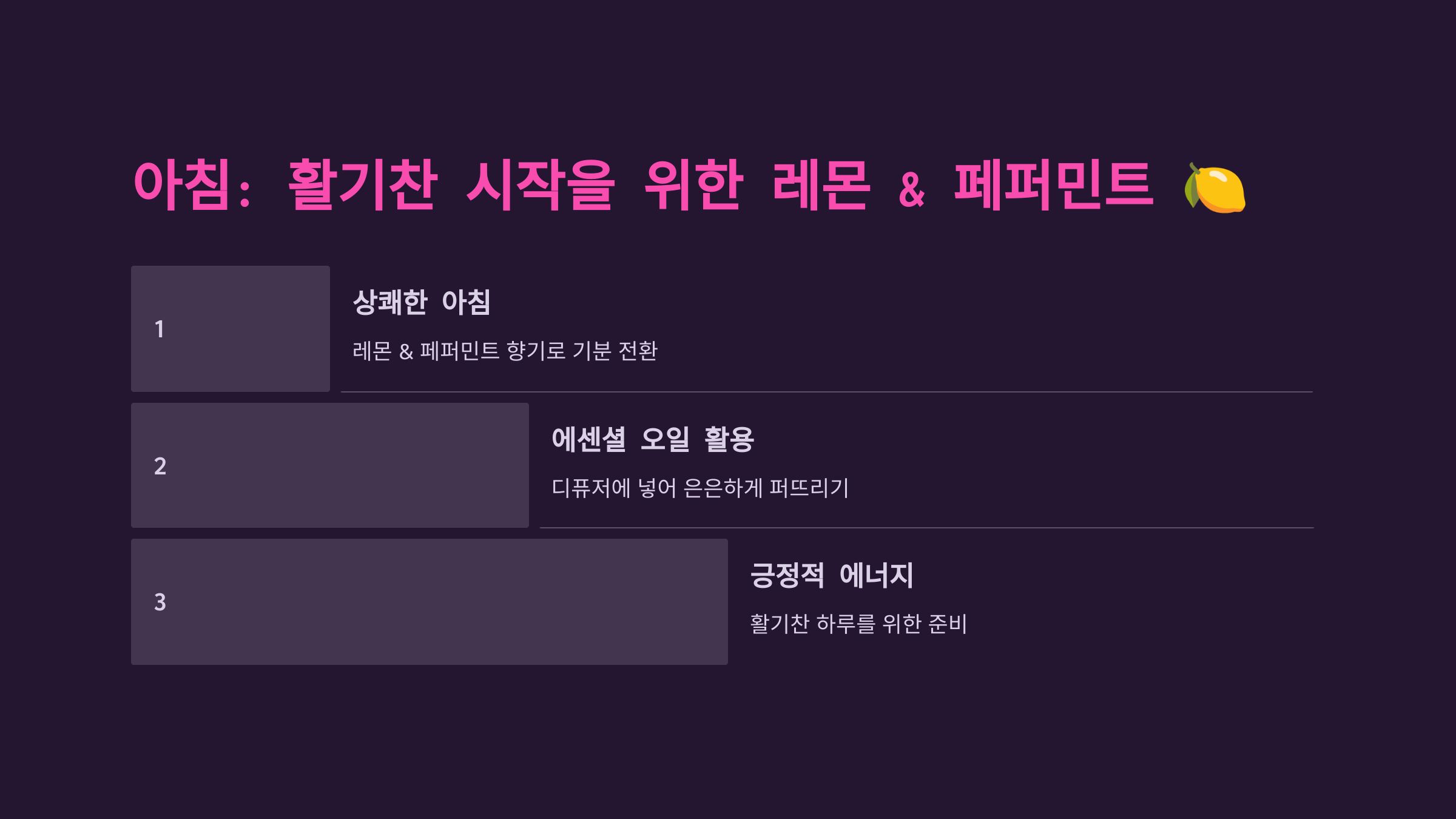 - 활용법: 레몬이나 페퍼민트 에센셜 오일을 디퓨저에 넣고 사용하면 상쾌한 향기로 잠이 깬 듯한 기분을 느낄 수 있습니다. 출근 전에 방 안에 은은하게 퍼트리면 긍정적이고 활기찬 하루를 준비하는 데 좋습니다.