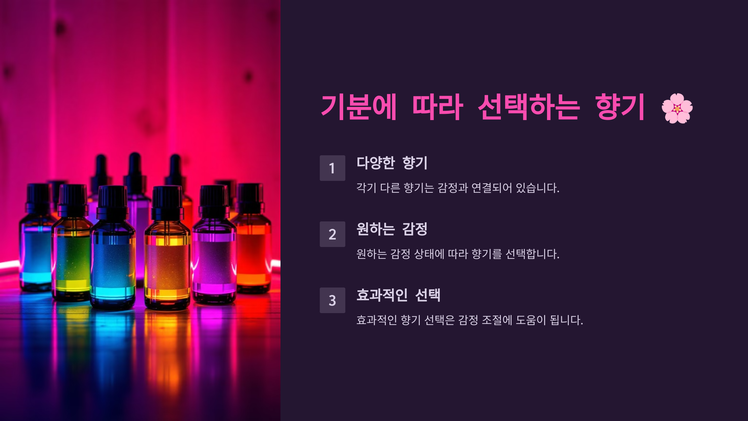향기는 단순한 향 이상으로 심리에 큰 영향을 미칩니다. 아침에는 상쾌한 향으로 활기차게 시작하고, 저녁에는 편안한 향으로 휴식을 취하며 하루의 스트레스를 날려보세요. 각 상황에 맞는 향기를 통해 심리적 안정과 행복감을 더해 기분 좋은 하루를 만들어 보시기 바랍니다.