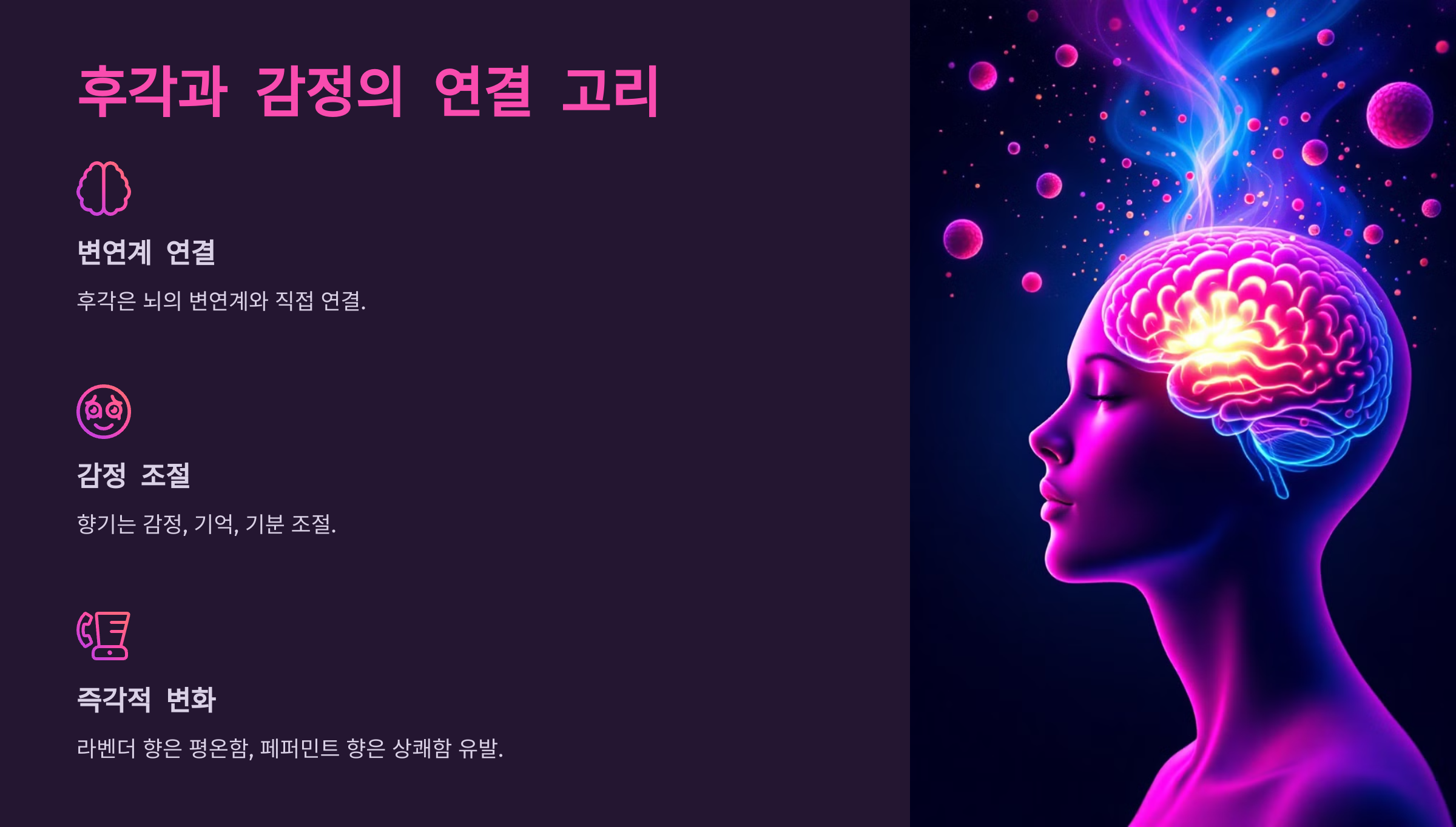 후각은 감정과 밀접한 관계가 있는 뇌의 ‘변연계’와 직접적으로 연결되어 있습니다. 향기를 맡으면 감정, 기억, 기분을 조절하는 뇌의 구조에 영향을 미쳐 즉각적인 감정 변화를 일으킵니다. 예를 들어, 라벤더 향을 맡으면 평온함을 느끼고, 페퍼민트 향을 맡으면 상쾌한 느낌이 드는 이유가 바로 여기에 있습니다.