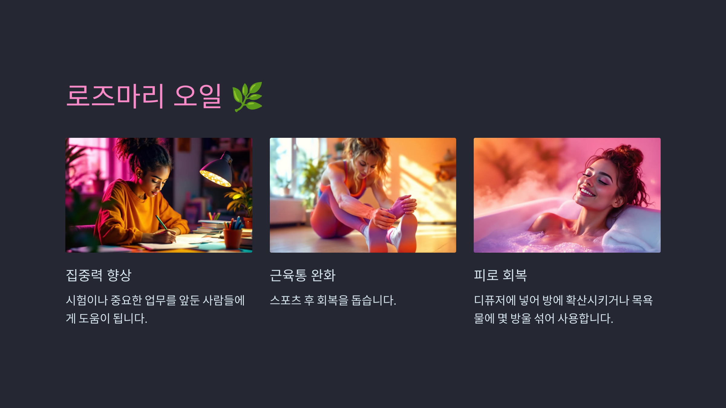 - 집중력 향상: 로즈마리와 페퍼민트 오일은 정신을 맑게 하고 집중력을 높여, 업무나 학습에 큰 도움을 줄 수 있습니다.
