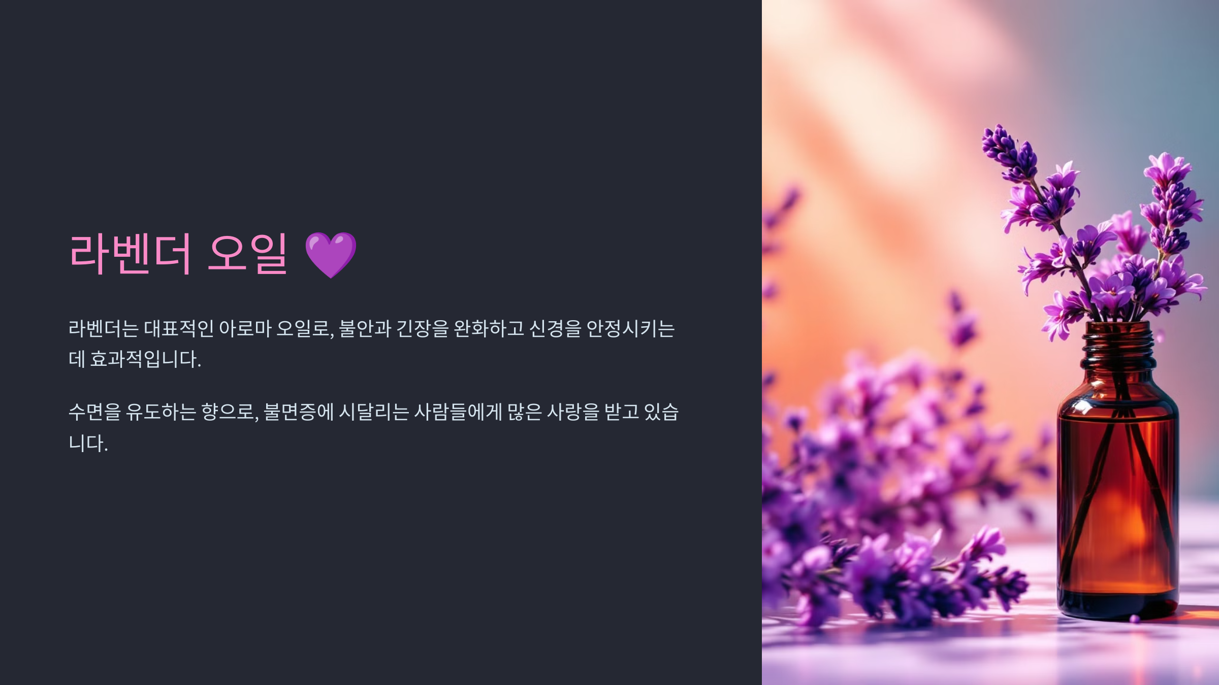 라벤더는 대표적인 아로마 오일로, 불안과 긴장을 완화하고 신경을 안정시키는 데 효과적입니다. 또한 수면을 유도하는 향으로, 불면증에 시달리는 사람들에게 많은 사랑을 받고 있습니다.