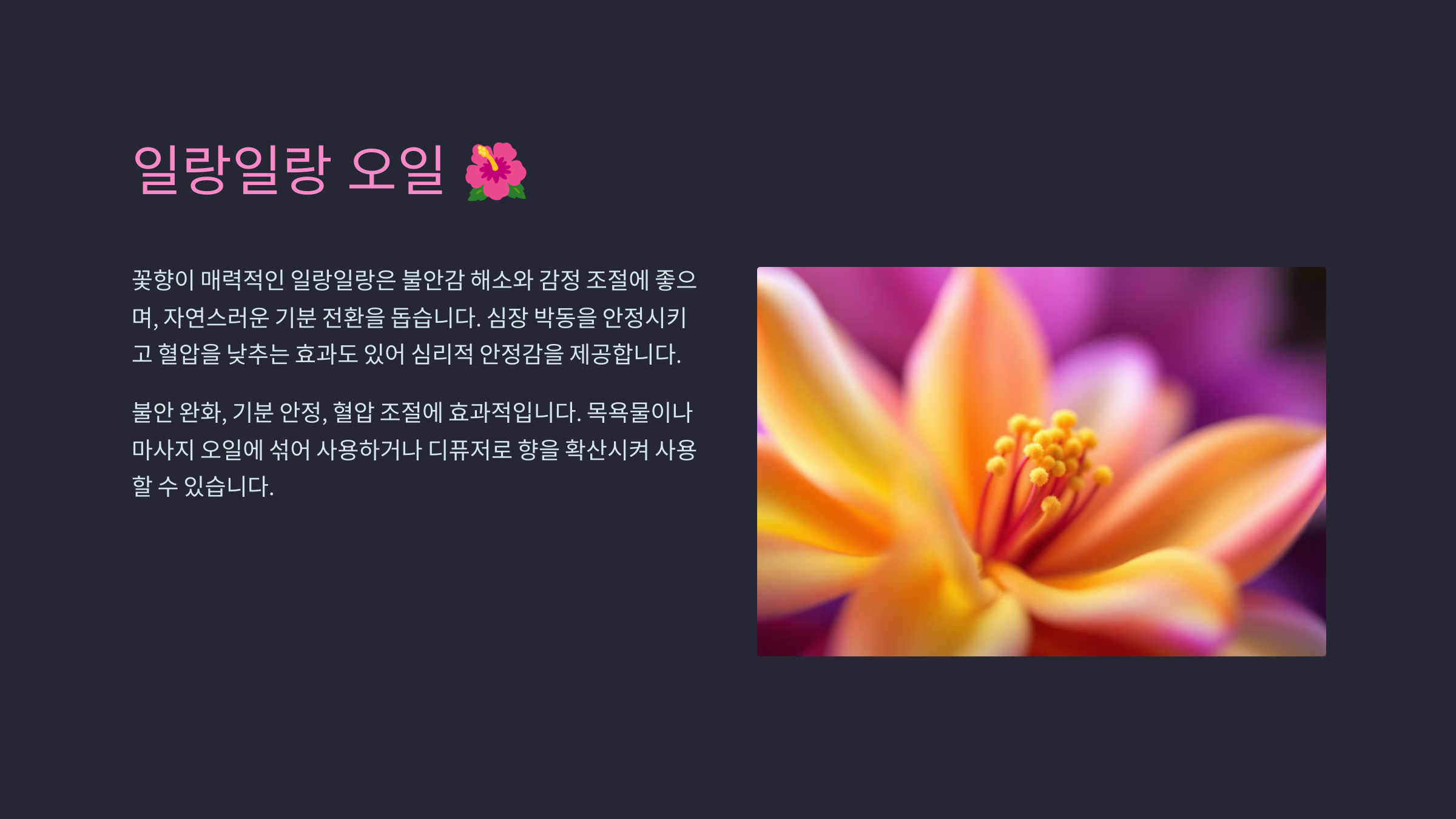 - 스트레스 완화 및 정신 안정: 라벤더, 일랑일랑, 베르가못 등의 오일은 마음을 차분하게 만들고, 스트레스를 완화하는 데 탁월한 효과를 보입니다.