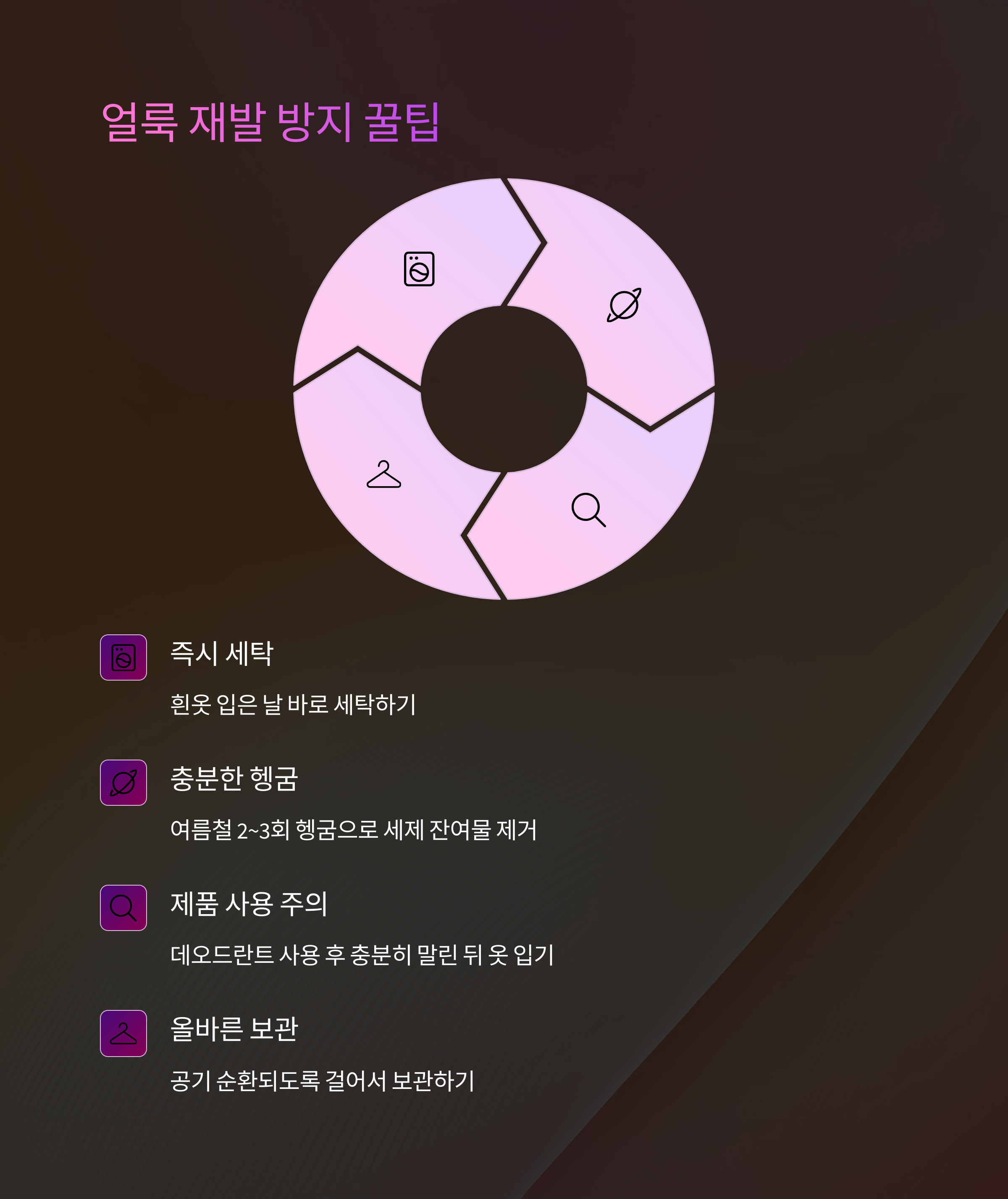 이제는 누런때가 다시 생기지 않도록 예방하는 게 중요하겠죠? 첫 번째로는 흰옷을 입은 날엔 바로 세탁하는 습관이 중요해요. 땀이 말라붙으면 제거가 더 어려워지거든요.