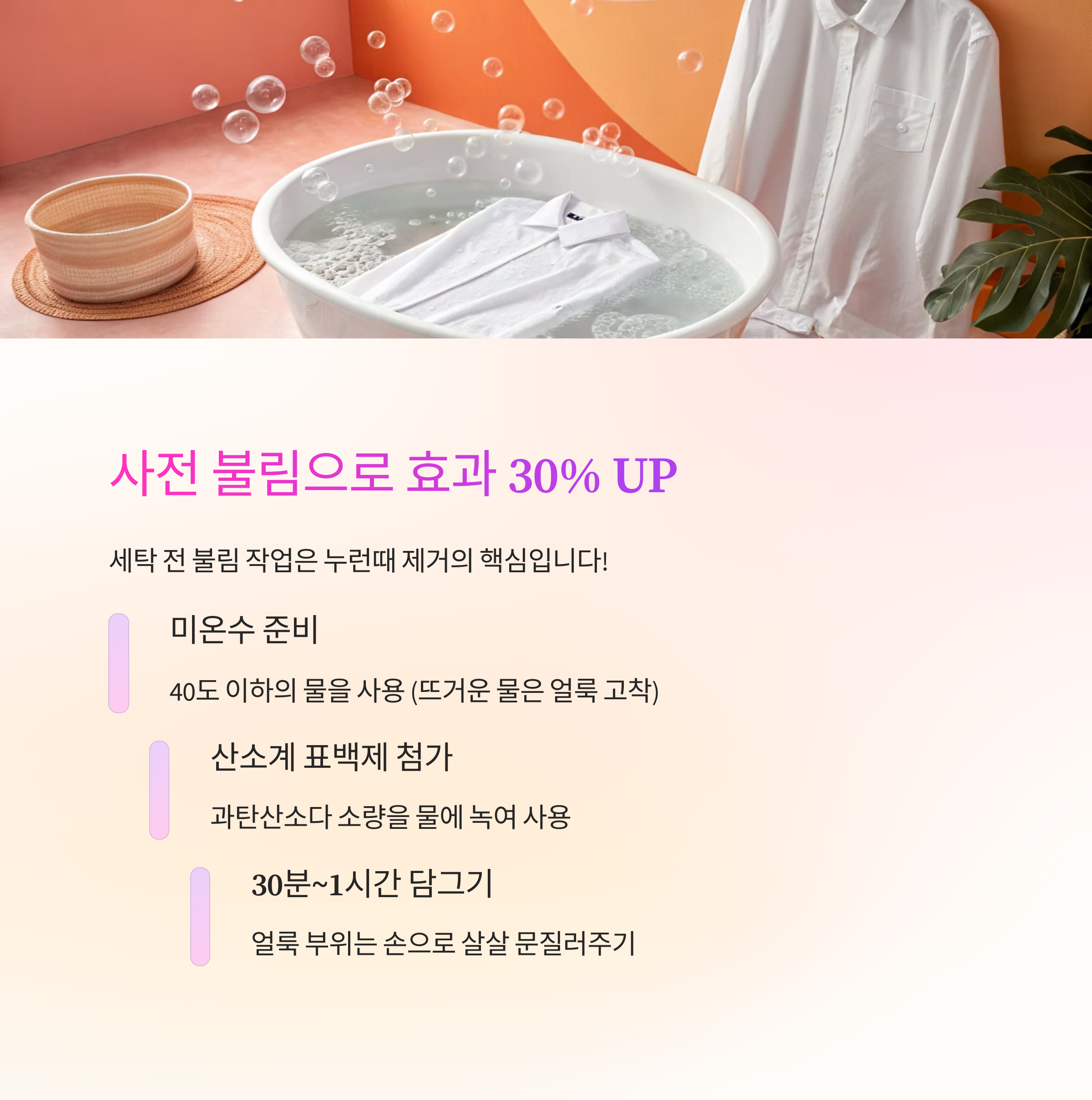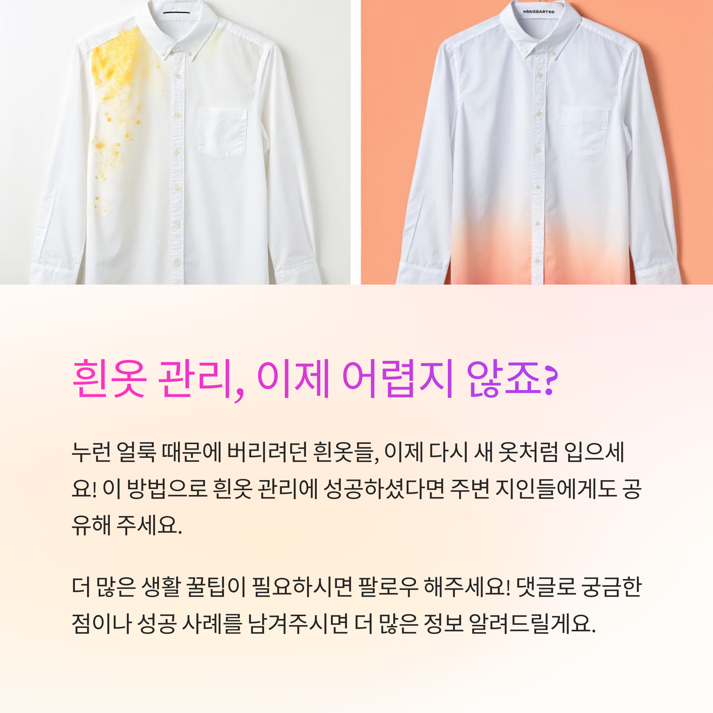 하지만 걱정 마세요! 제가 직접 시도해 본 순서를 알려줄게요. 제가 생각했을 때 가장 효과적이었던 순서와 팁들을 자세히 정리했어요. 이대로만 따라오면 흰옷 본연의 깨끗함을 다시 찾을 수 있을 거예요 😊