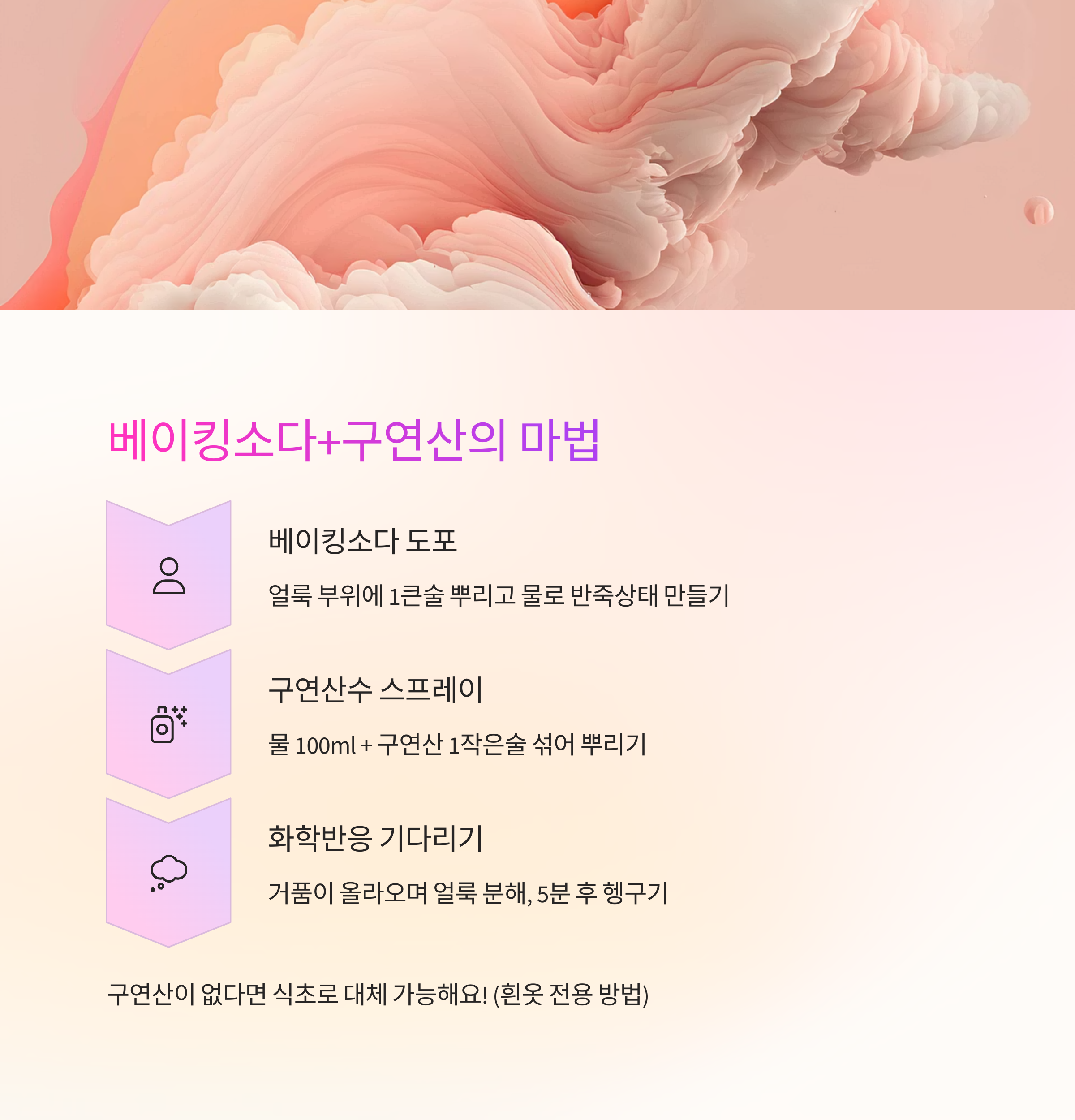 이때 거품이 올라오는데, 이게 바로 산-염기 반응이에요. 이 화학 반응이 얼룩을 자연스럽게 분해해 줘요. 5분간 방치한 뒤 헹궈내면 초기 얼룩이 많이 사라져요.