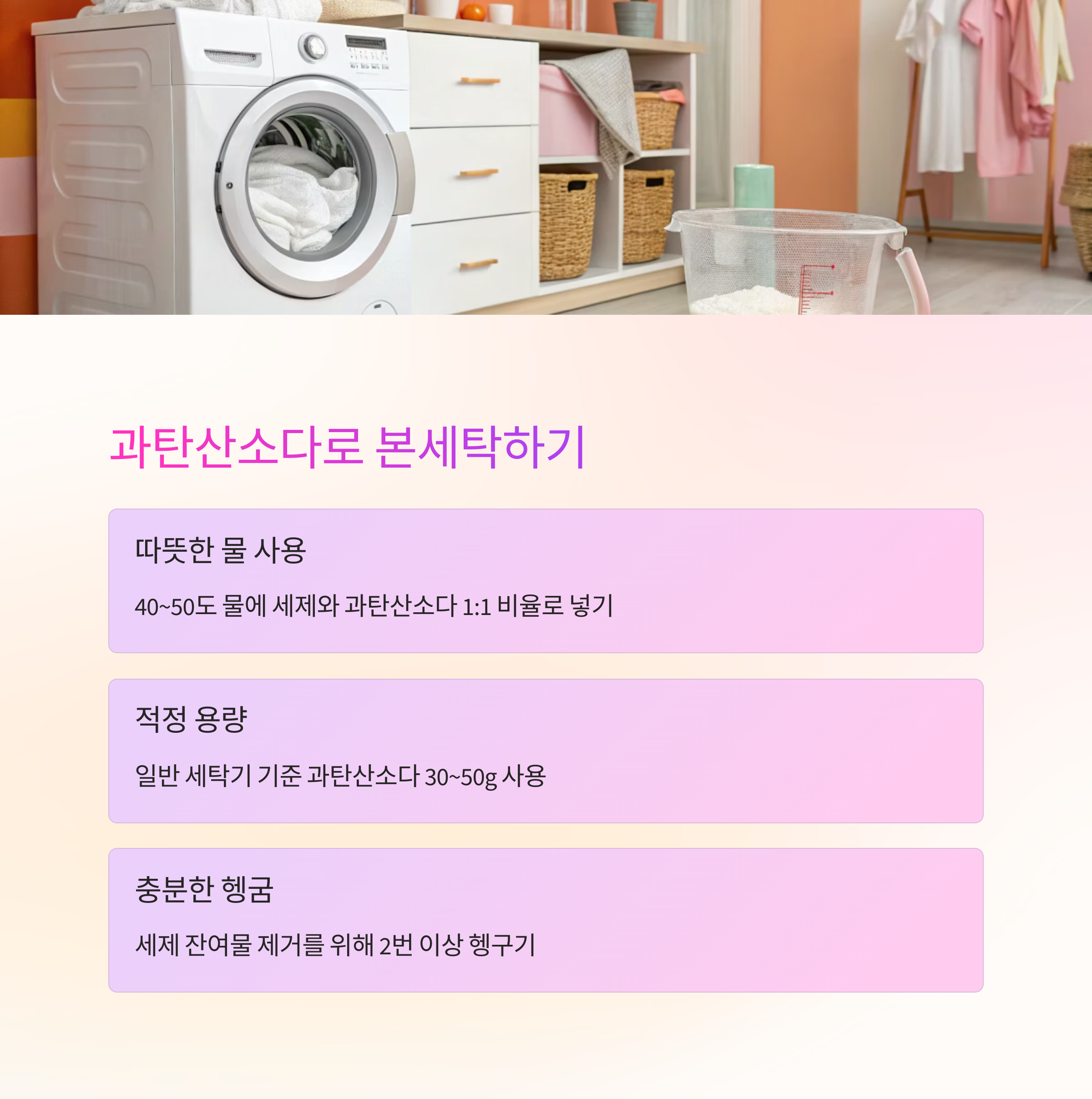 세탁조에 따뜻한 물(40~50도)을 채우고, 세탁 세제와 과탄산소다를 1:1 비율로 넣어주세요. 일반 세탁기라면 과탄산소다 30~50g이면 충분해요.