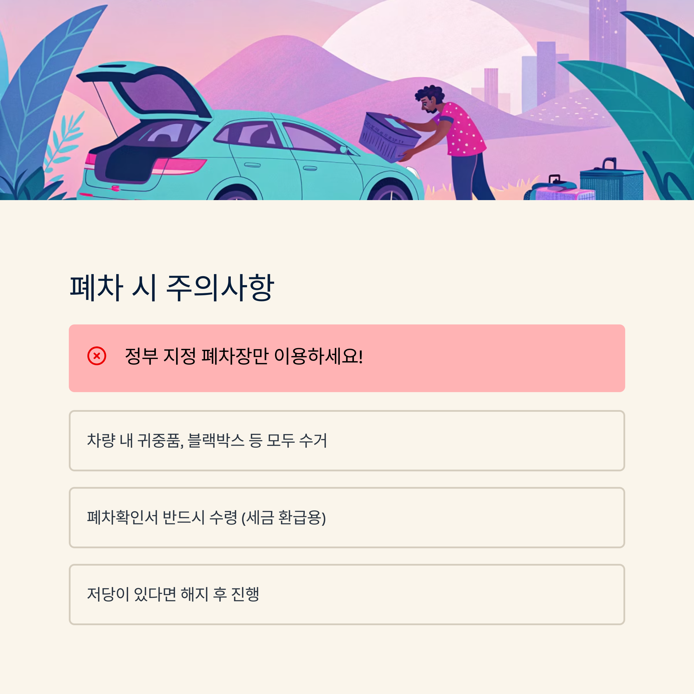 이렇게 체크리스트만 잘 따라가도 불이익 없이 깔끔하게 폐차를 마무리할 수 있어요. 폐차는 단순히 차량을 없애는 일이 아니라, 혜택을 최대한 활용할 수 있는 기회이기도 해요. 꼼꼼함이 결국 내 지갑을 지켜준다는 사실! 💡