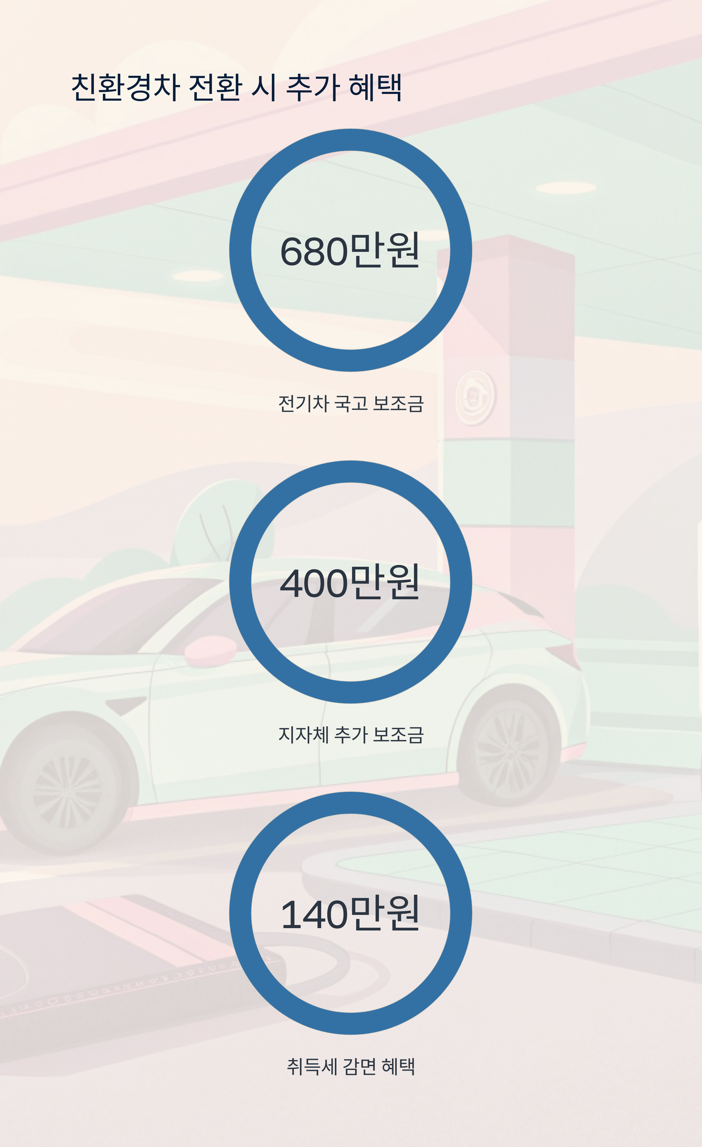 10년 이상된 차량을 폐차하고 전기차나 수소차 등 친환경차로 전환하면 훨씬 더 많은 혜택을 받을 수 있어요. 정부에서는 조기폐차 보조금에 더해 친환경차 구매 보조금을 별도로 지급하고 있어요. 이 두 가지를 동시에 받으면 최대 1,500만 원 가까운 혜택이 가능하답니다.