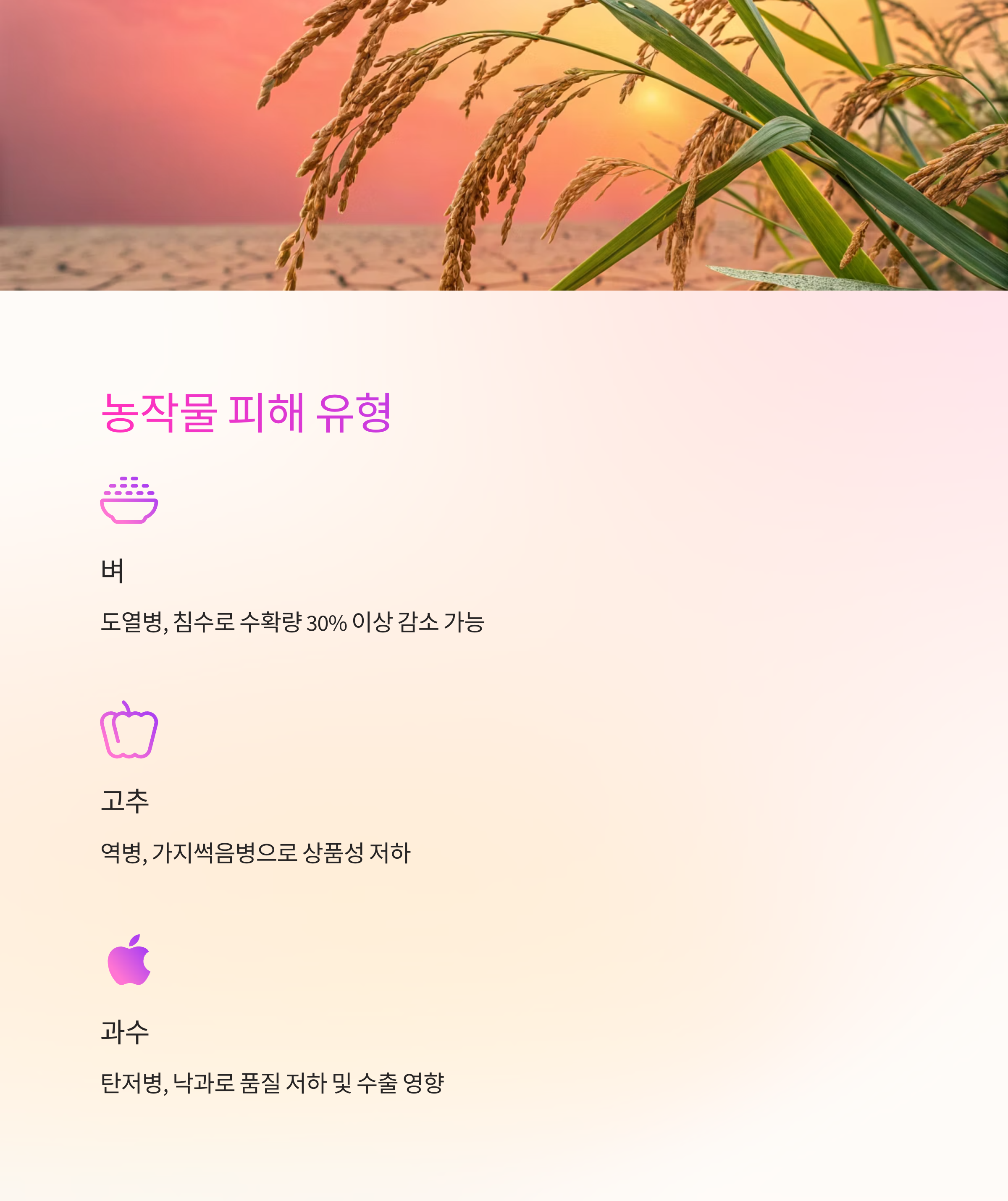 | 벼 | 도열병, 침수 | 수확량 감소 |