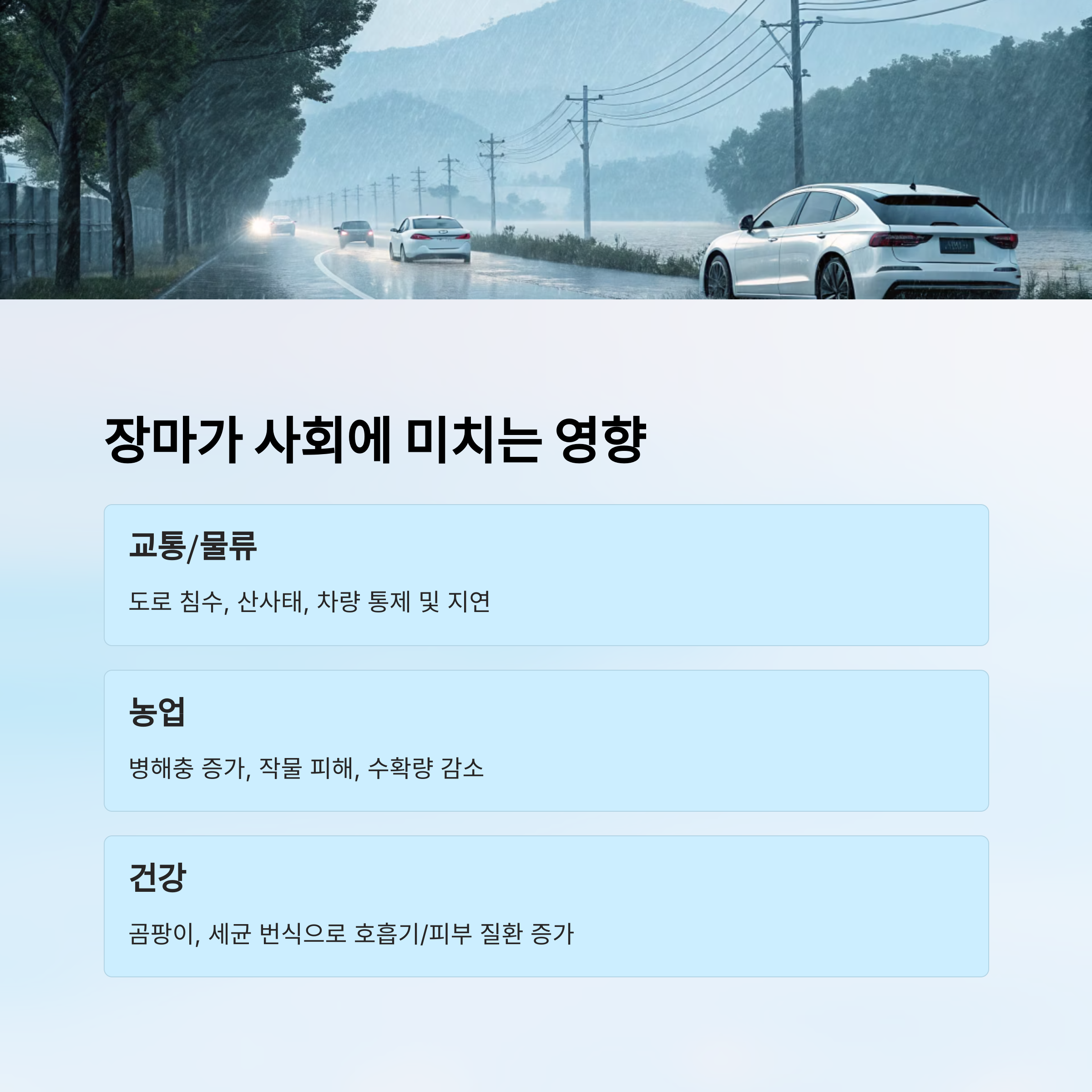 장마는 단순히 비가 많이 오는 계절이 아니라, 우리 사회 곳곳에 영향을 주는 복합적인 현상이기도 해요. 그중 가장 먼저 드러나는 것은 교통과 물류 분야의 문제들이에요. 도로 침수나 산사태, 터널 사고 등이 빈번하게 발생하면서 차량 통제와 지연이 생기곤 하죠.