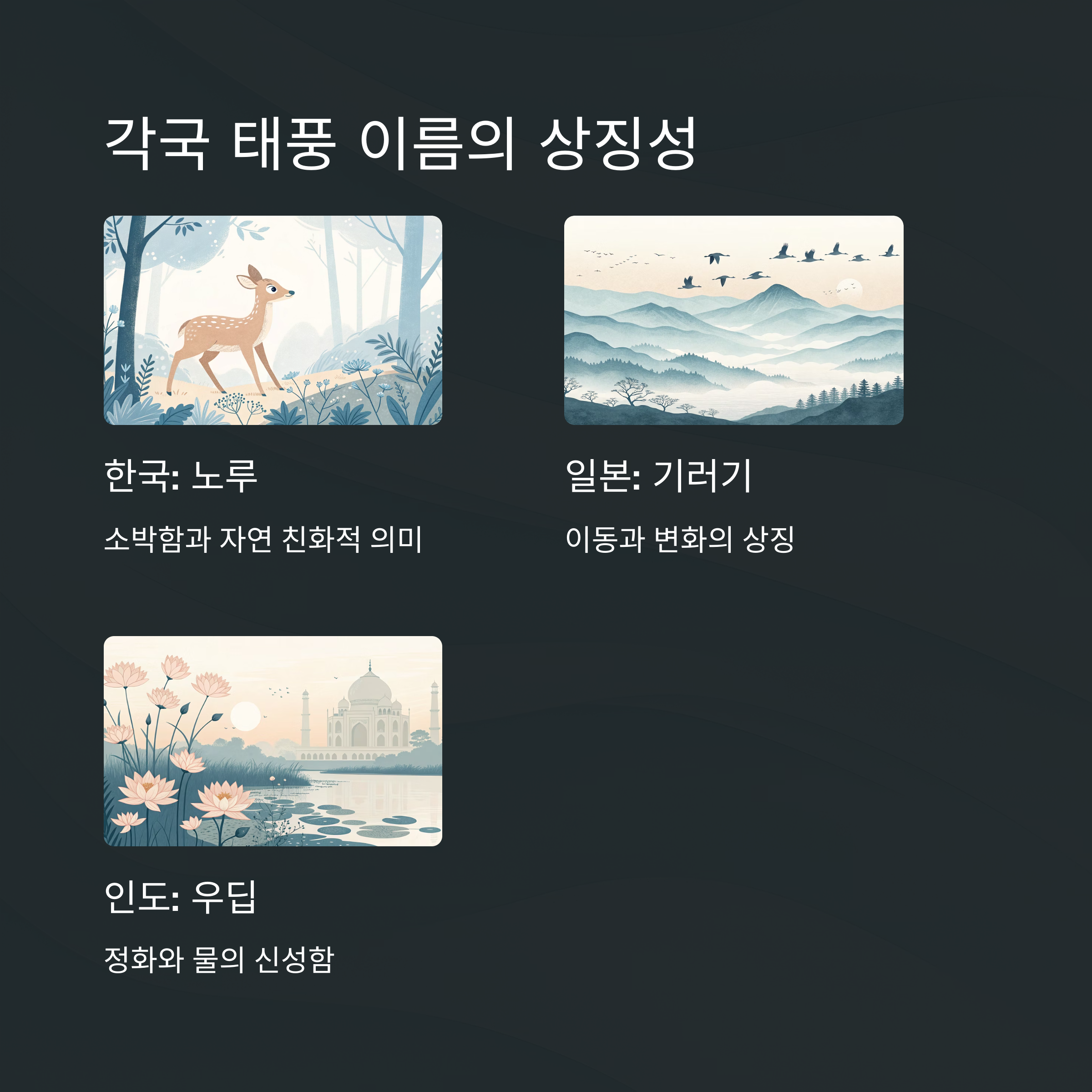 우리나라에서 제출한 태풍 이름 중에도 '개미', '나리', '노루' 같은 소박하고 귀여운 이름들이 많아요. 이는 동물이나 꽃을 통해 자연을 바라보는 따뜻한 시선을 드러내는 거죠. 반대로 중국은 '망온(망연자실)', 일본은 '기러기'처럼 자연의 운동성과 관련된 단어를 많이 사용해요.