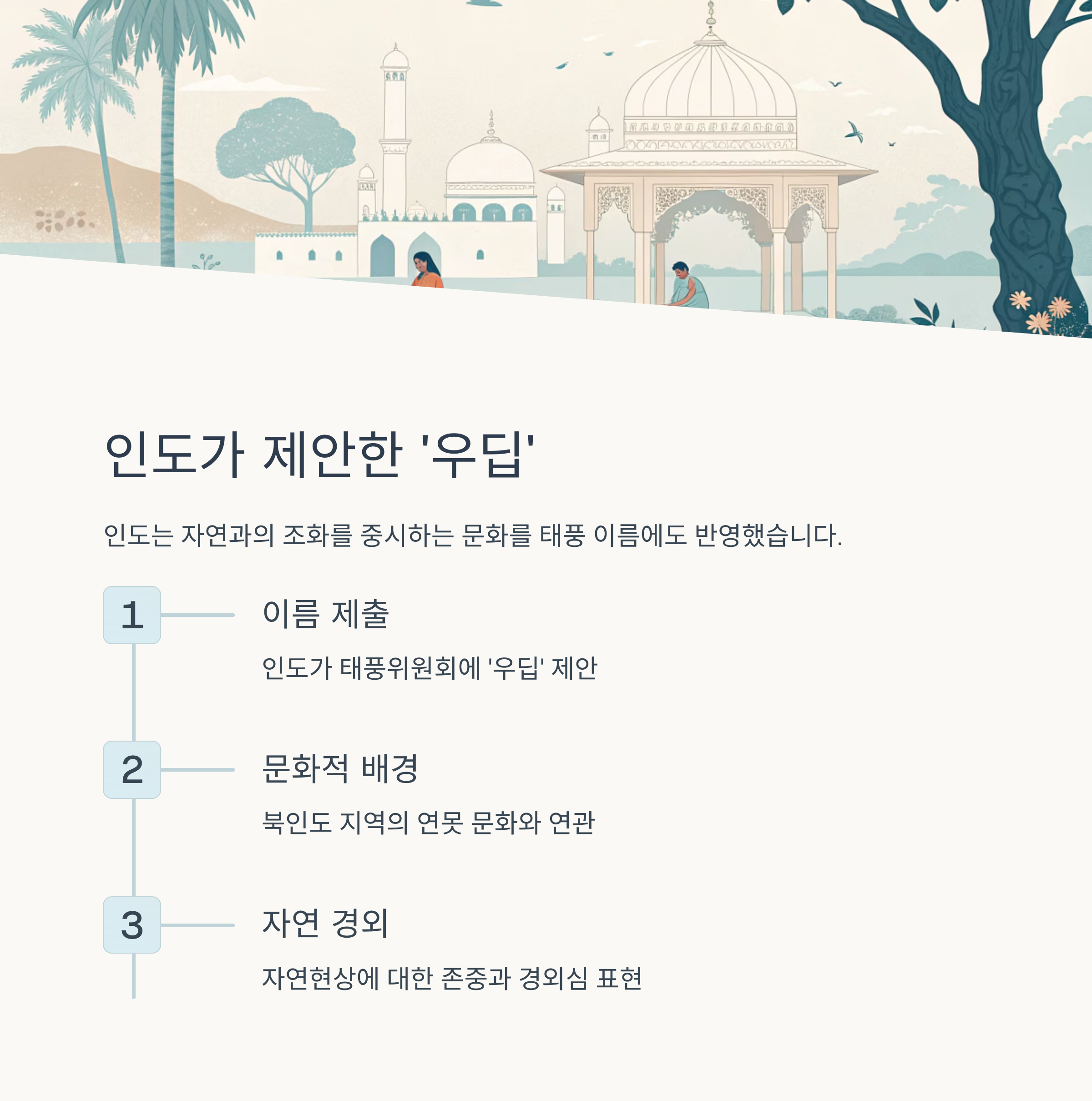 인도는 예로부터 자연과의 조화 속에서 살아가는 전통을 중요시해왔고, 태풍과 같은 자연현상에도 두려움보다는 경외의 시선을 보내는 문화가 강해요. 이런 철학이 태풍 이름 선정에도 반영되어 ‘우딥’처럼 평화롭고 고요한 이름이 채택된 거랍니다.