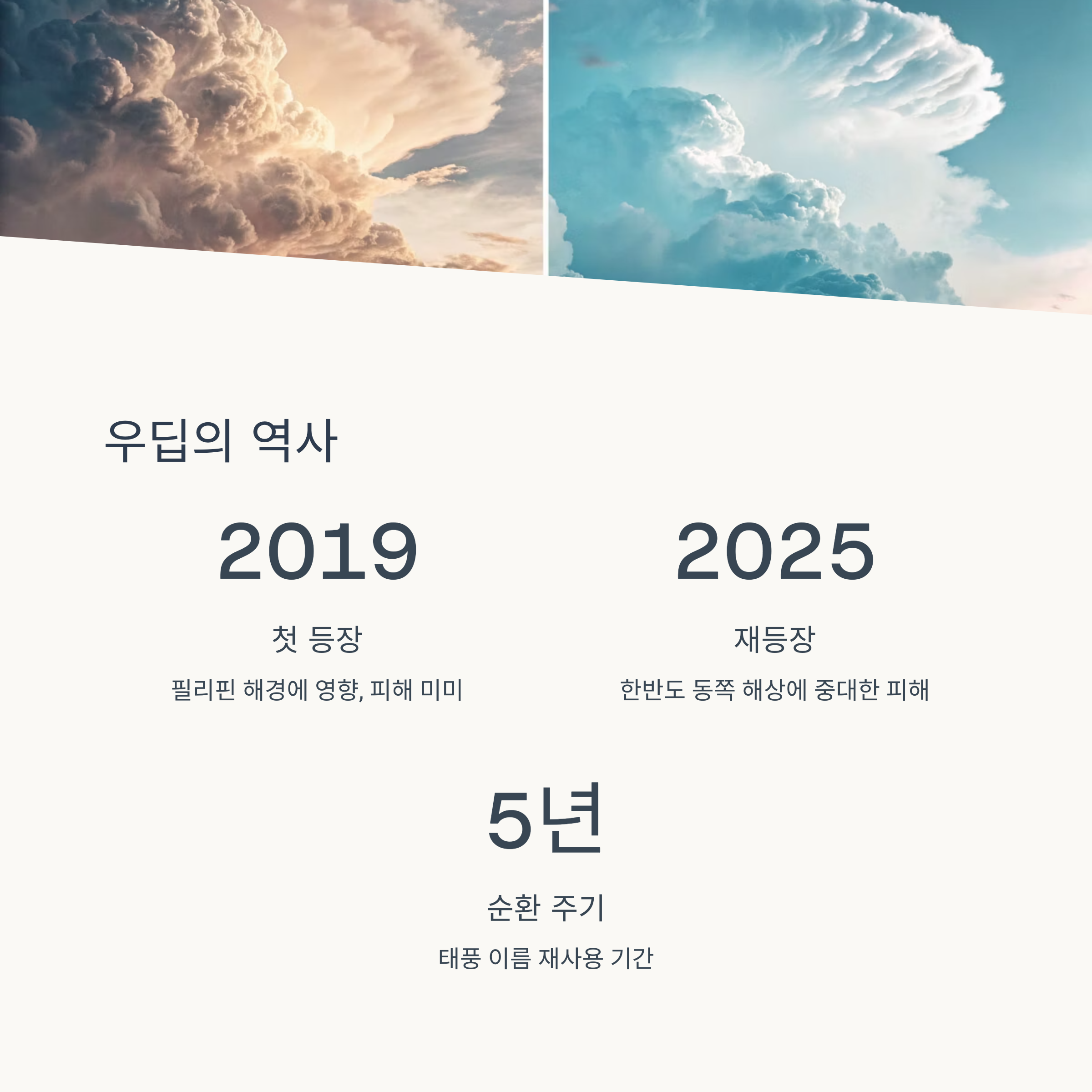 2025년 태풍 '우딥'이 처음으로 사용된 것은 아니에요. 사실 이 이름은 이미 과거에도 사용된 적이 있어요. 처음 이 이름이 등장한 것은 2019년이었고, 당시에는 큰 피해를 일으키지 않아 이름이 폐기되지 않았죠. 그래서 다시 2025년 태풍 이름 순번에 재등장하게 된 거예요.