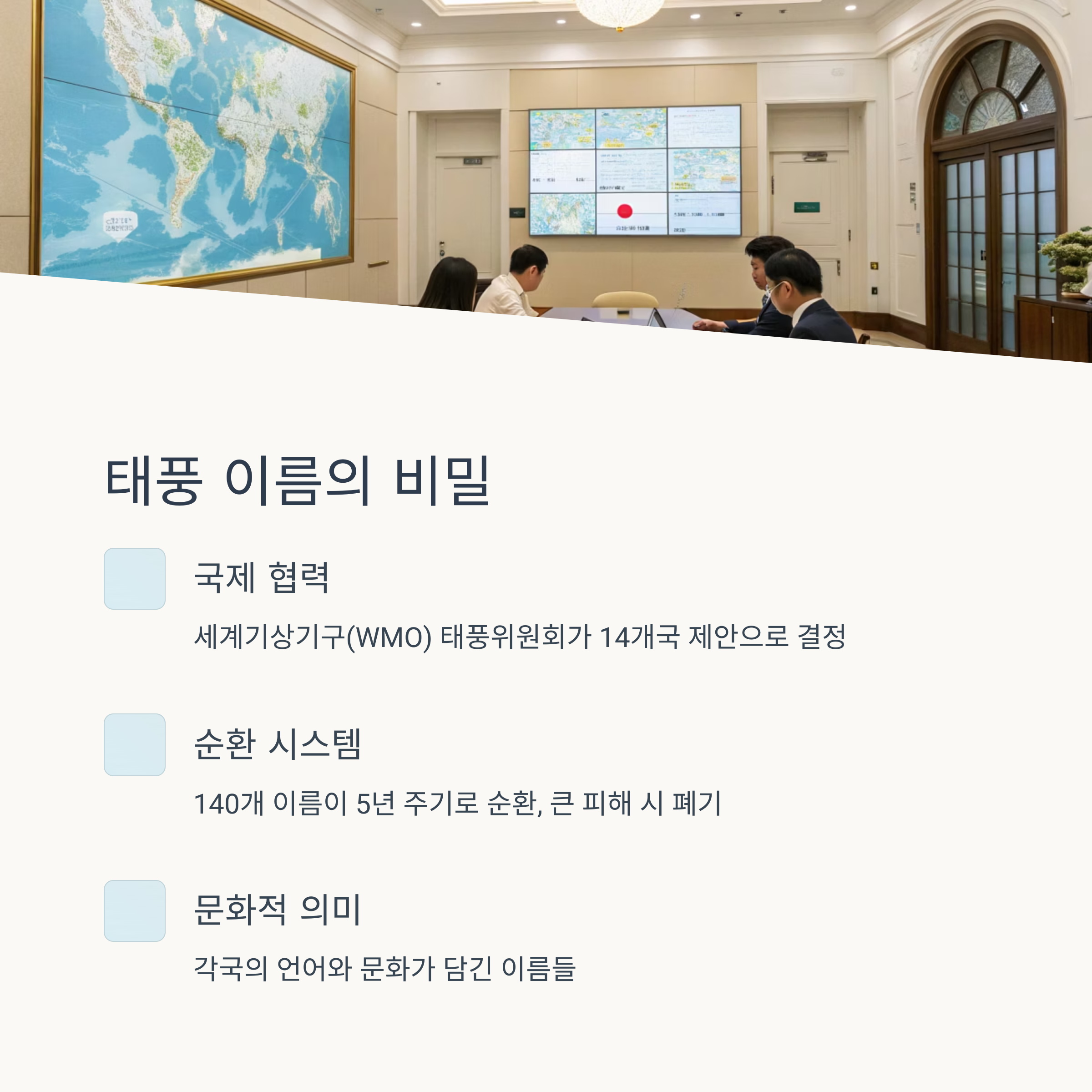태풍의 이름은 즉흥적으로 정해지는 것이 아니라, 아주 체계적인 절차를 통해 결정돼요. 세계기상기구(WMO)의 태풍위원회에서 운영하는 이 시스템은 14개 아시아-태평양 국가가 참여하는 국제 협력체랍니다.