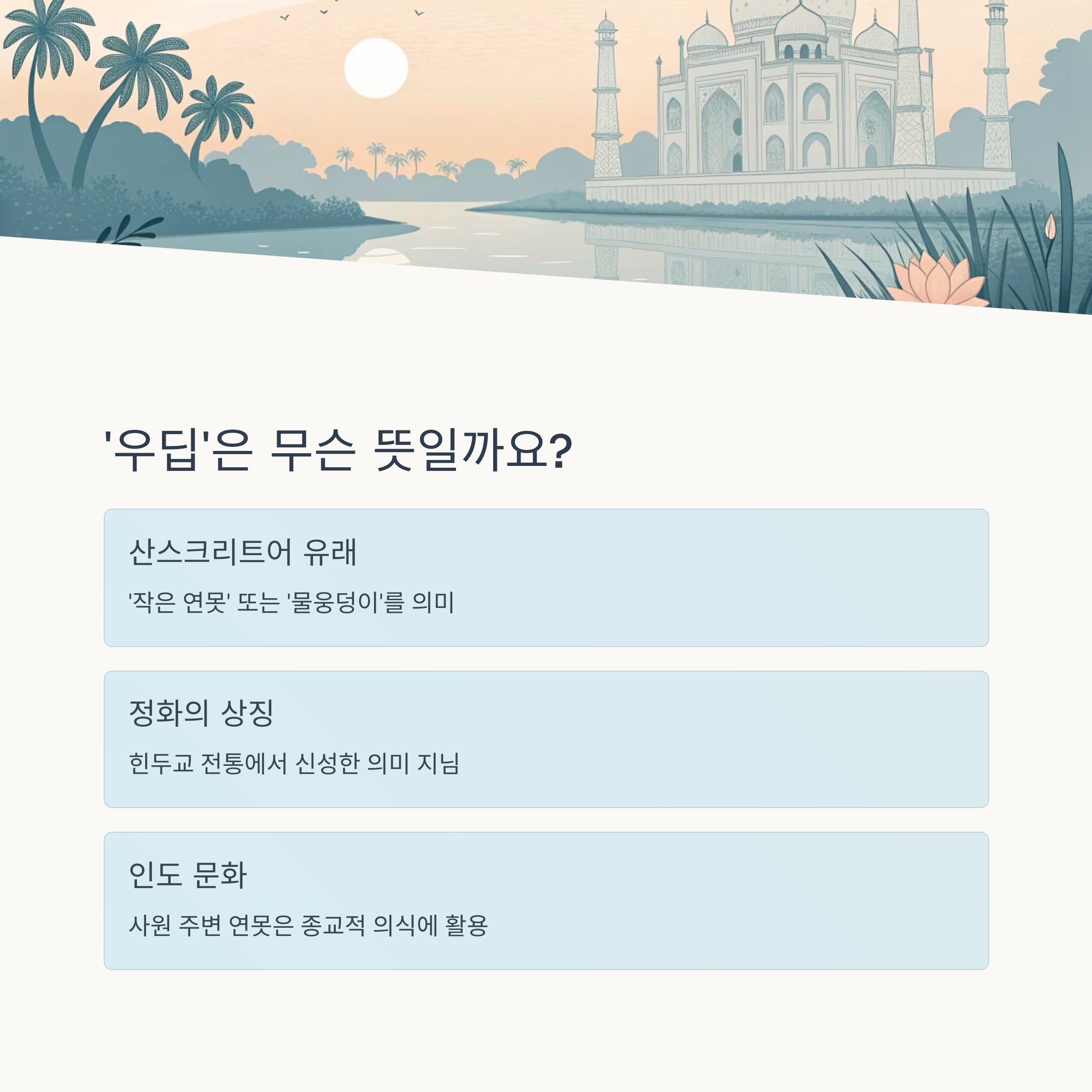 ‘우딥’이라는 단어는 특히 북인도 지역에서 연못이나 물웅덩이를 의미해요. 이는 단순한 지리적 요소가 아닌, 종교적인 요소와도 밀접하게 연관돼 있어요. 인도의 많은 사원 주변에는 ‘쿠완’이나 ‘우딥’이라고 불리는 작은 연못이 있고, 이는 제례나 정화 의식에 활용돼요.