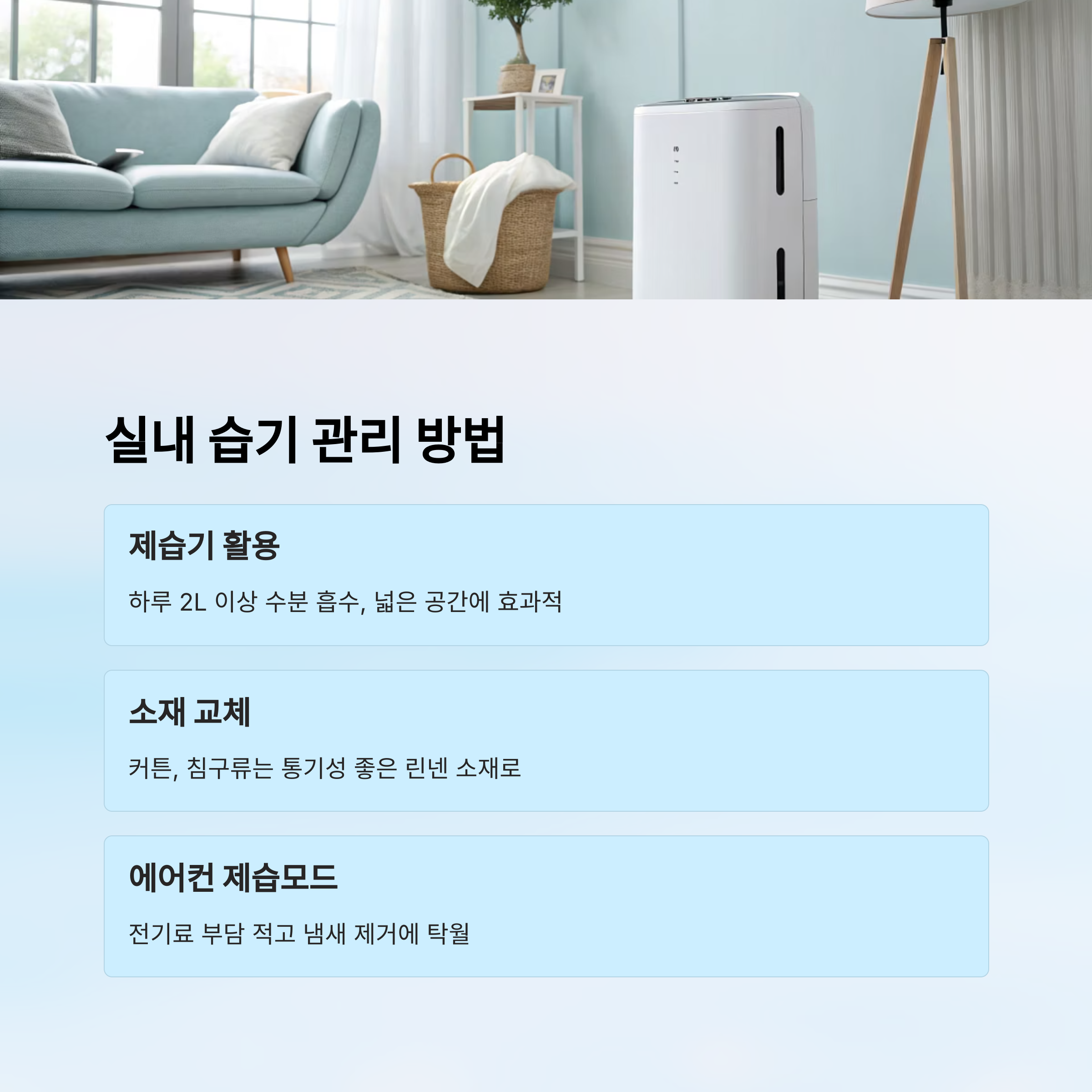 제가 생각했을 때 실내에서 가장 간단하면서도 효과 좋은 방법은 '에어컨 제습모드 켜두기'예요. 전기료도 생각보다 크게 차이 안 나고, 실내 공기까지 시원하게 관리돼요. 특히 냄새 제거에 탁월하답니다! 🌬