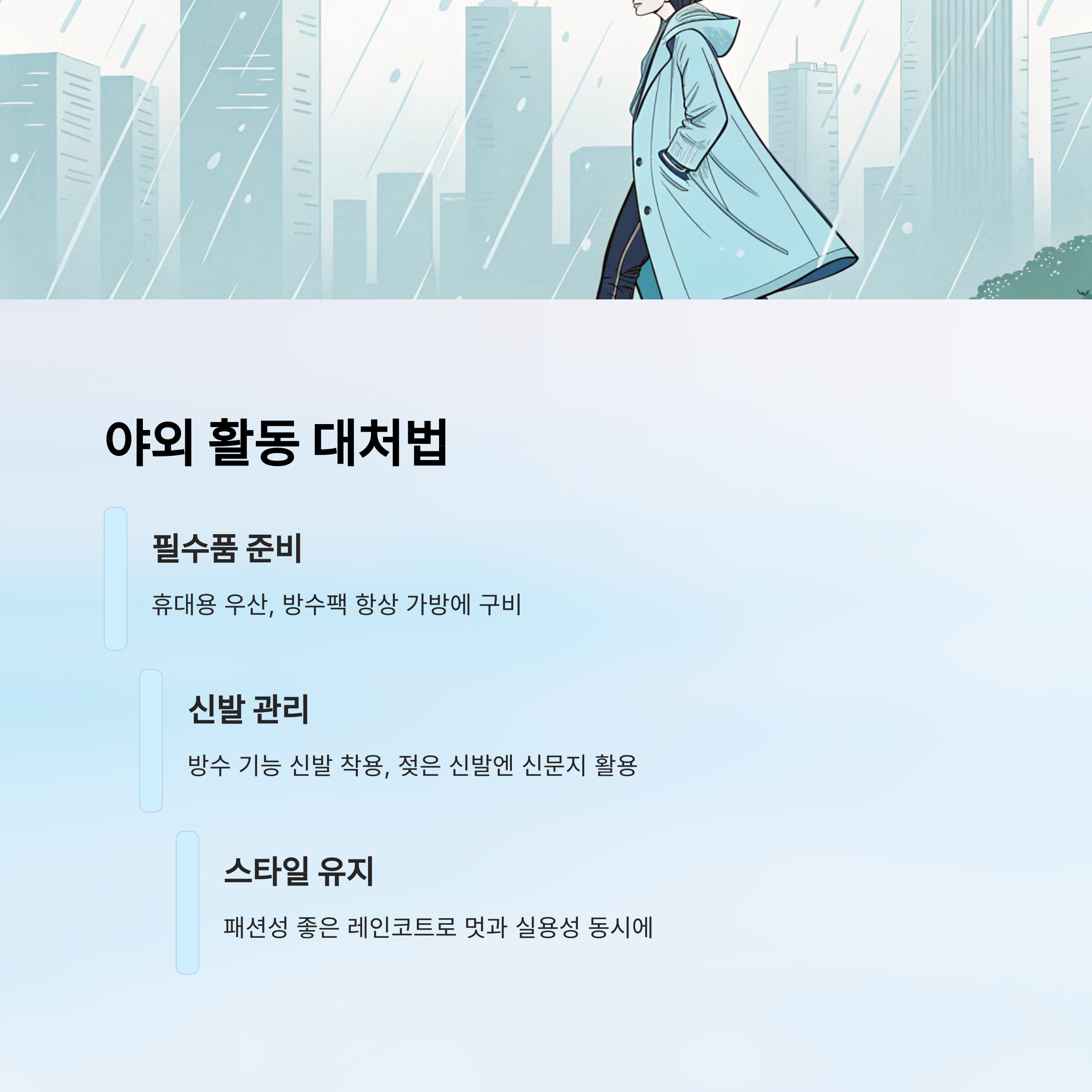 장마철이라고 해서 외출을 아예 안 할 수는 없죠! 하지만 미리 대처법을 알고 있으면 갑작스런 비에도 당황하지 않고 잘 넘길 수 있어요. 먼저, 가방 속에는 반드시 휴대용 우산과 방수팩을 준비해두는 걸 추천해요.