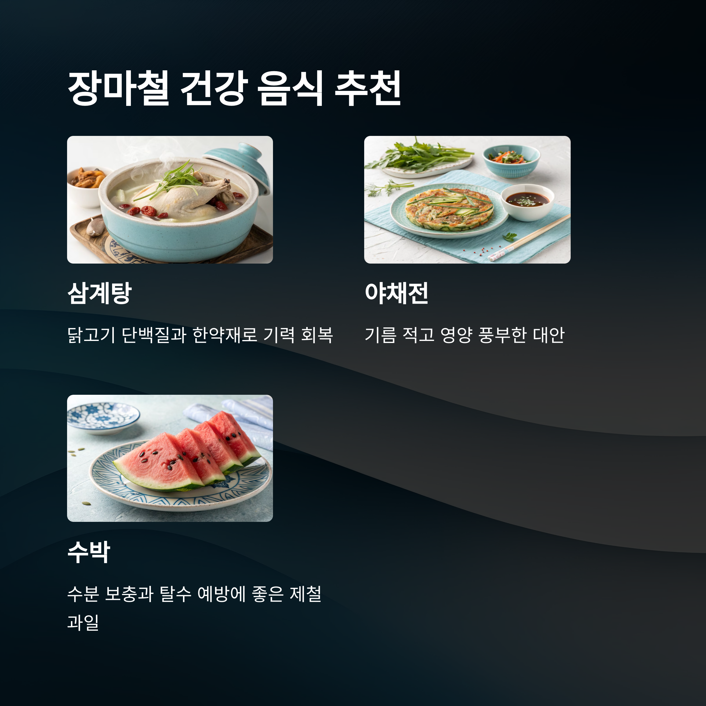 장마철엔 체력도 떨어지고, 입맛도 사라지기 쉬워요. 이럴 땐 위생도 중요하고, 면역력도 챙길 수 있는 음식을 먹는 게 좋답니다. 대표적으로 추천하고 싶은 음식은 '삼계탕'이에요. 닭고기 단백질과 한약재가 기력 회복에 최고예요!
