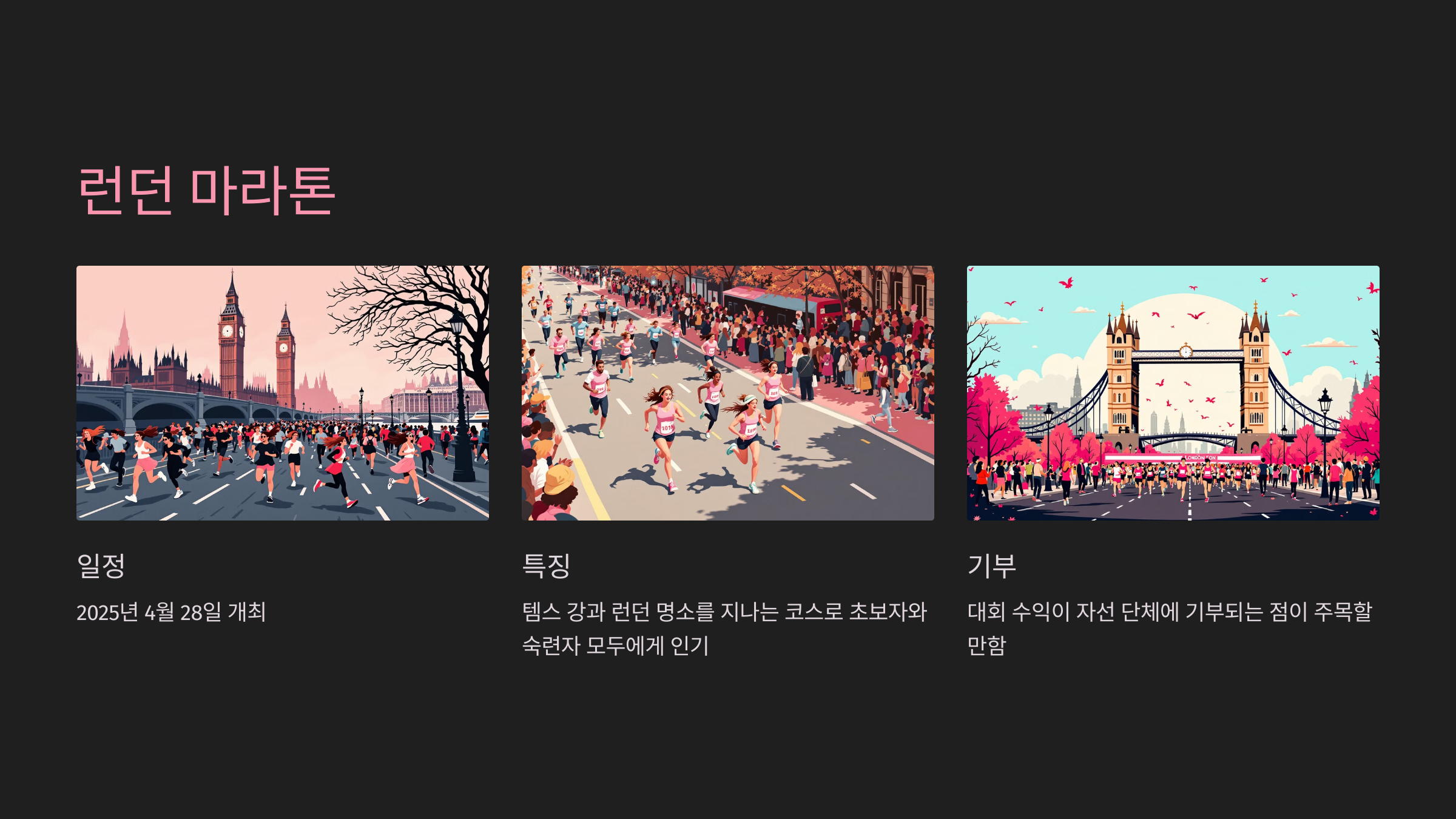 - 특징: 템스 강과 런던의 대표 명소들을 지나며 달리는 코스로, 초보자와 숙련자 모두에게 인기가 많습니다. 대회 수익이 다양한 자선 단체에 기부되는 점도 주목할 만합니다.
