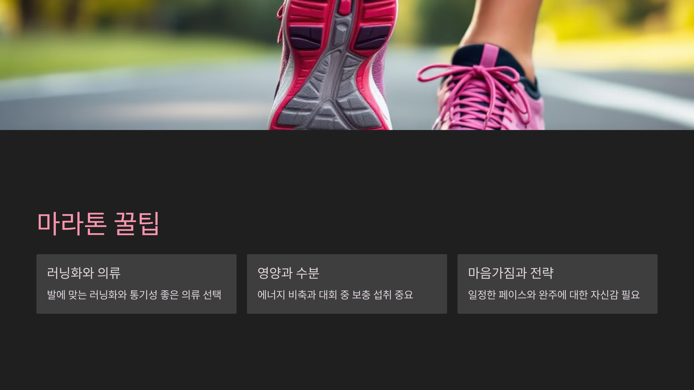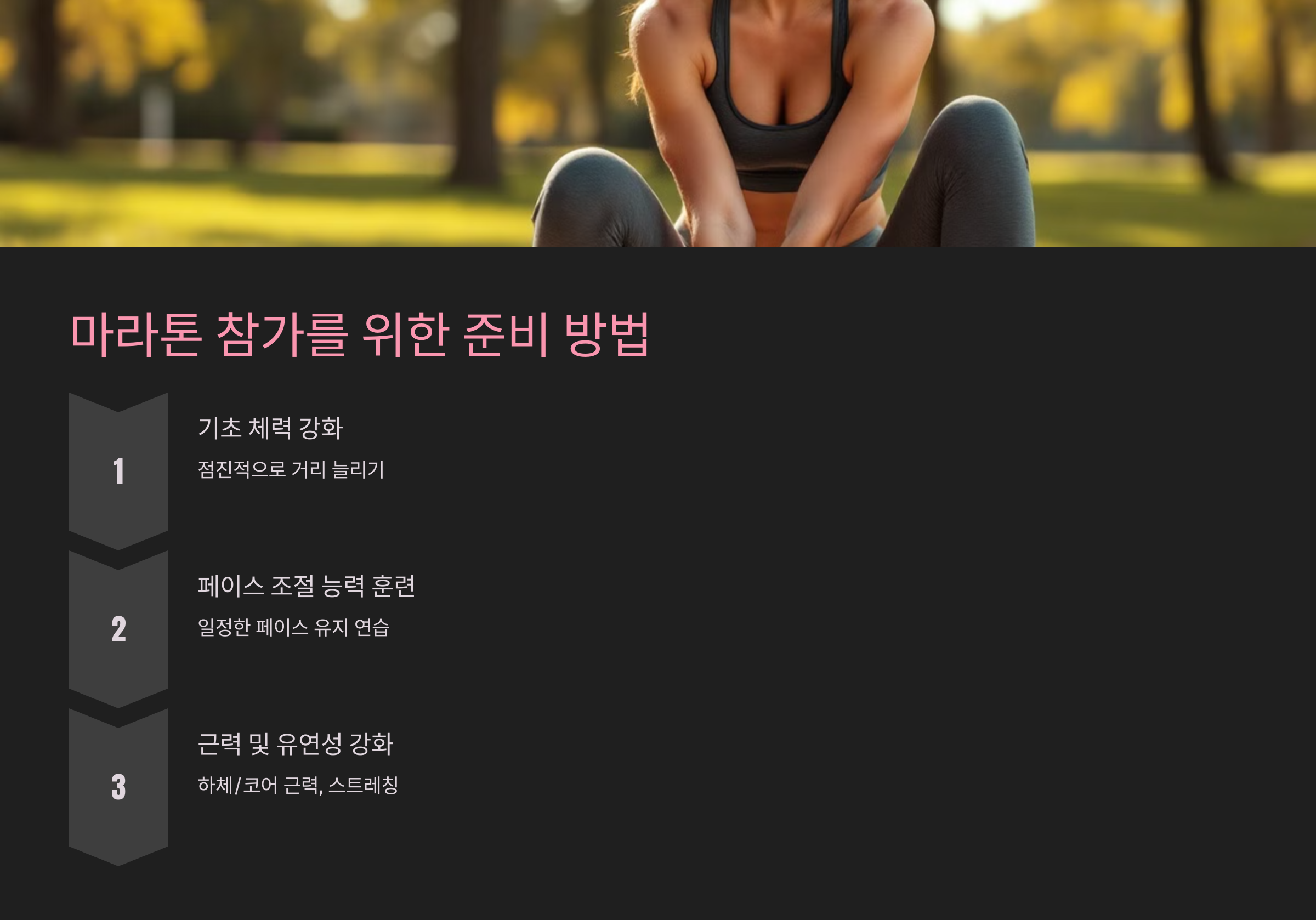 일정한 페이스를 유지하며 달리는 연습을 통해 대회 날 에너지 분배를 효과적으로 할 수 있도록 준비하세요. 목표 페이스에 익숙해질 수 있도록 주기적으로 연습하세요. - 근력 및 유연성 강화
