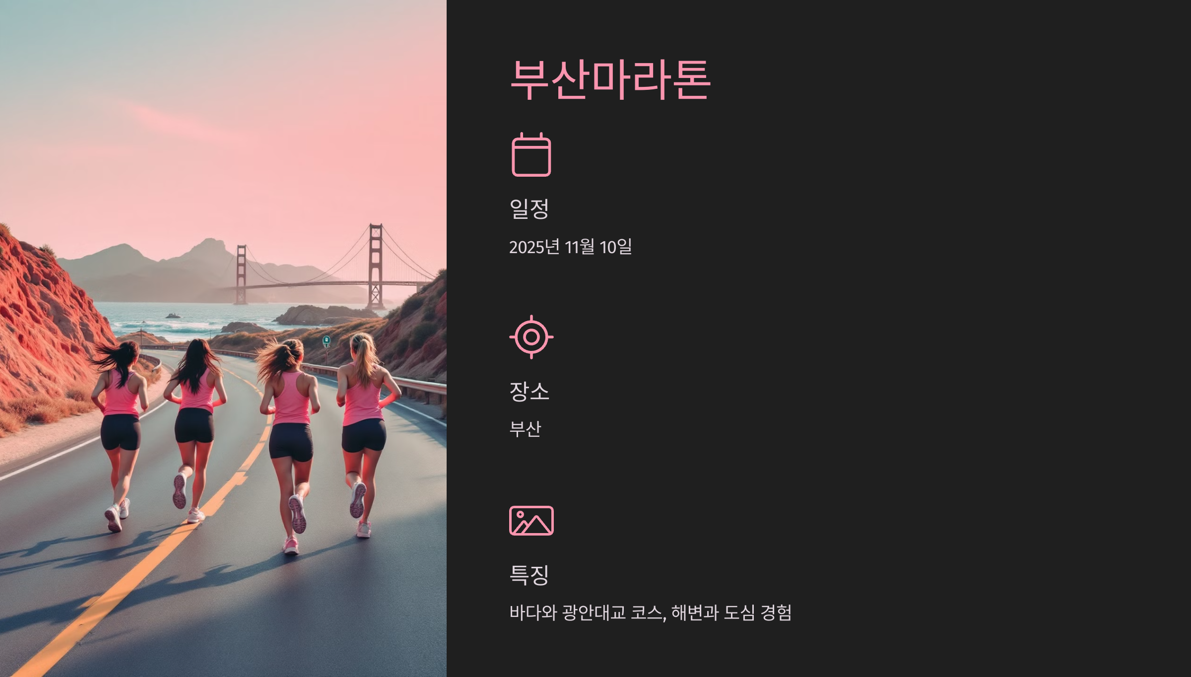 - 특징: 바다를 배경으로 달리는 대회로, 광안대교를 포함한 다채로운 코스가 매력적입니다. 해운대와 광안리의 해변을 따라 달리며, 도심과 자연을 동시에 경험할 수 있는 특별한 기회를 제공합니다.