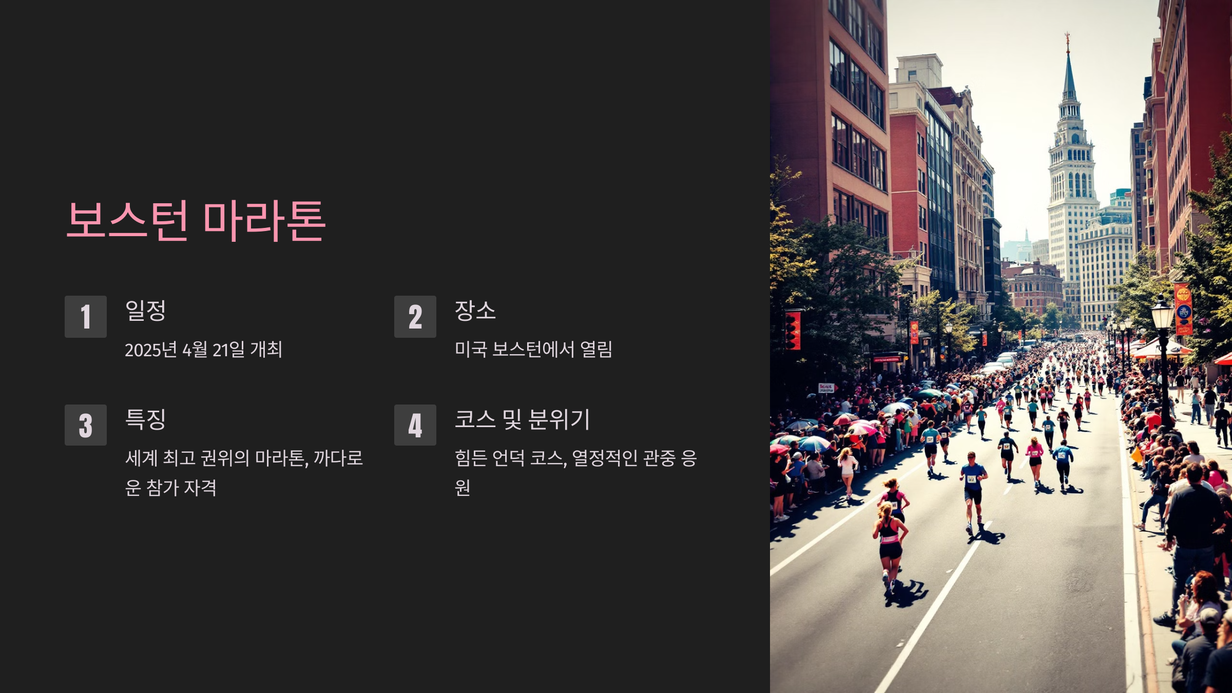 - 특징: 세계에서 가장 오래된 마라톤 대회로, 참가 자체가 큰 영예로 여겨집니다. 까다로운 참가 자격 조건을 만족해야만 출전할 수 있으며, 힘든 언덕 코스와 관중들의 열띤 응원이 어우러져 특별한 경험을 선사합니다.