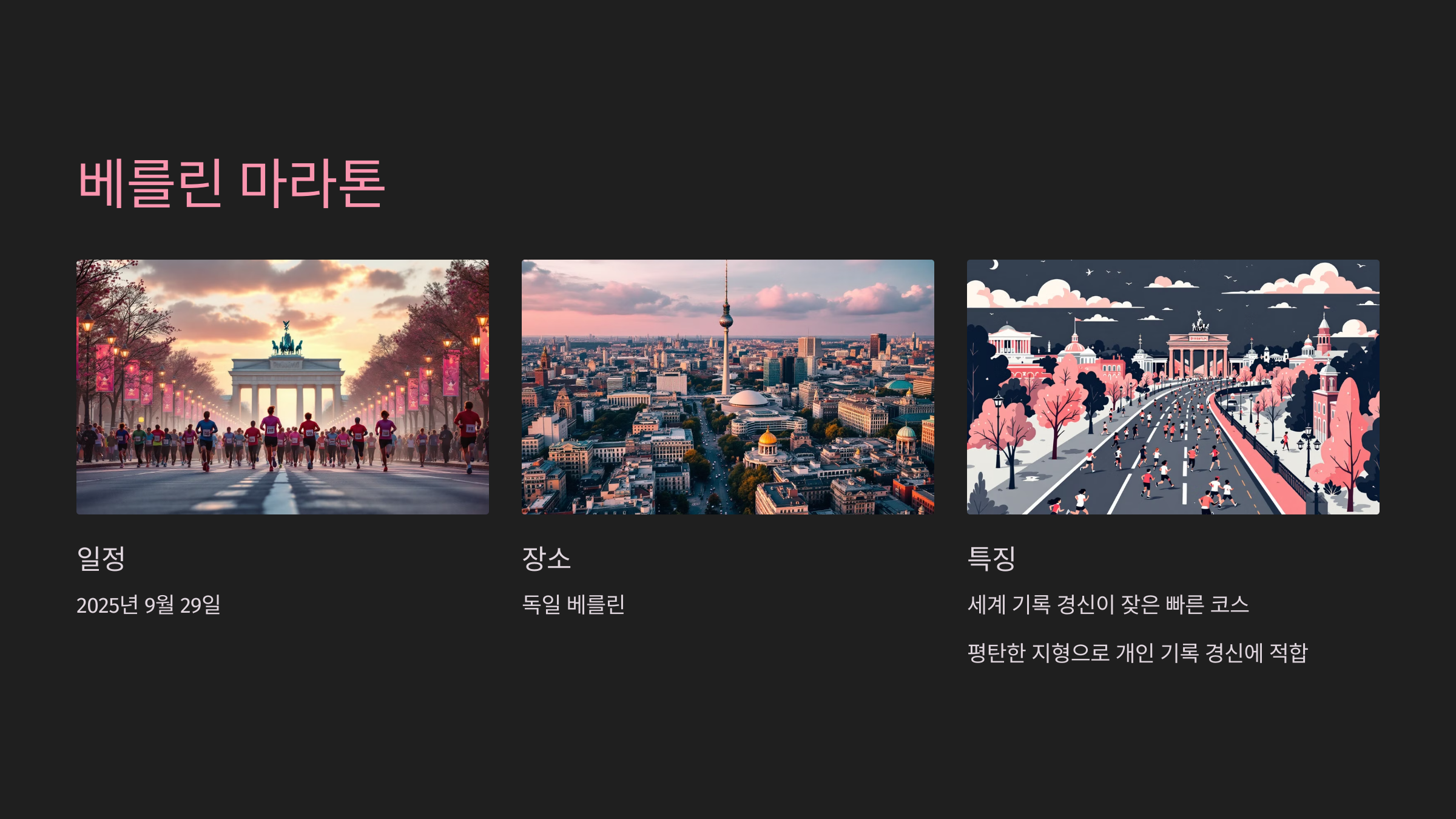 - 특징: 세계 기록이 자주 경신되는 빠른 코스로 유명합니다. 평탄한 지형 덕분에 개인 기록 경신을 목표로 하는 러너들에게 이상적입니다.