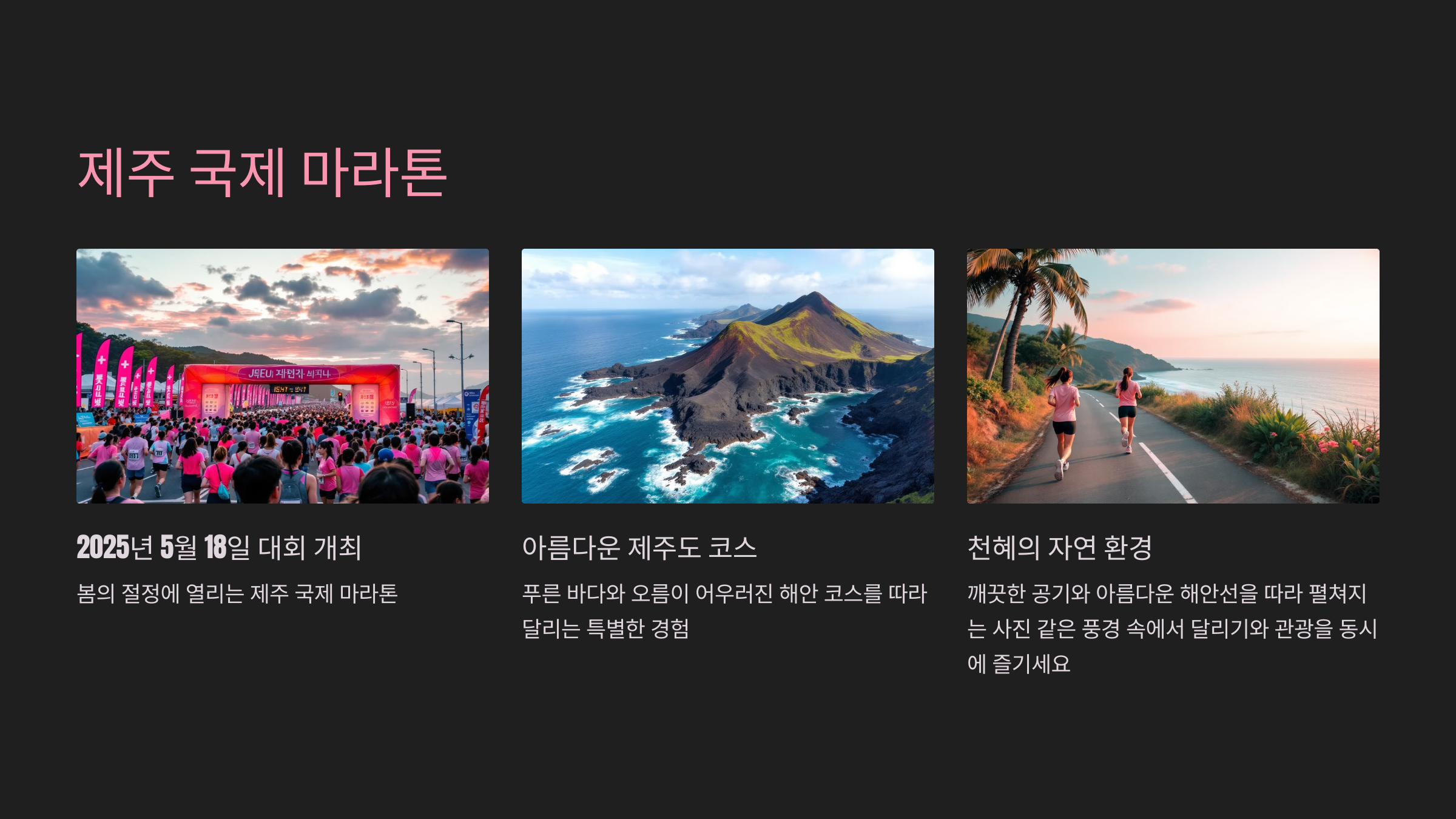 - 특징: 아름다운 자연 경관과 깨끗한 공기를 만끽하며 달릴 수 있는 대회입니다. 해안선을 따라 펼쳐지는 코스는 사진 같은 풍경을 자랑하며, 관광과 운동을 동시에 즐길 수 있는 기회입니다.