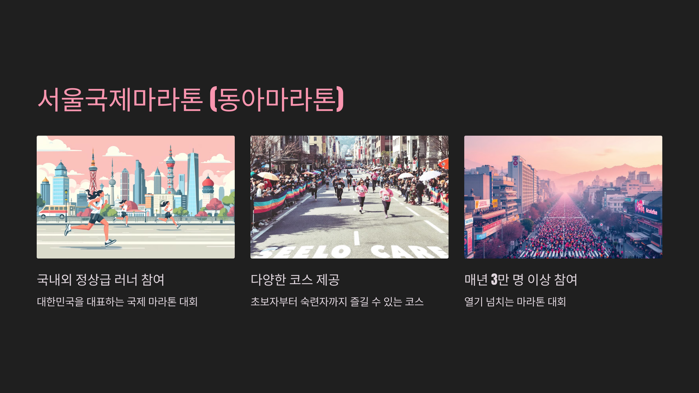 - 특징: 대한민국을 대표하는 국제 마라톤 대회로, 국내외 정상급 러너들이 참여합니다. 도심 속을 달리며 서울의 랜드마크를 감상할 수 있으며, 초보자부터 숙련자까지 즐길 수 있는 다양한 코스가 마련되어 있습니다. 매년 약 3만 명이 넘는 러너들이 참여해 열기를 더합니다.
