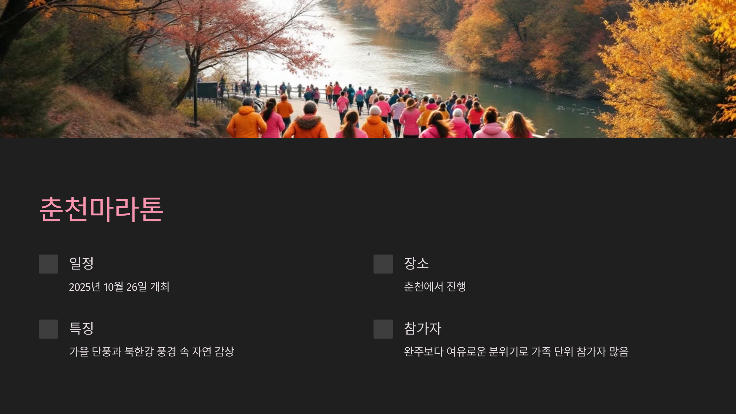 - 특징: 가을 단풍과 북한강의 풍경을 배경으로 달릴 수 있는 낭만적인 대회입니다. 완주보다 자연을 즐기는 데 초점을 맞춘 러너들에게 특히 추천되며, 가족 단위의 참가자들도 많아 여유로운 분위기가 특징입니다.
