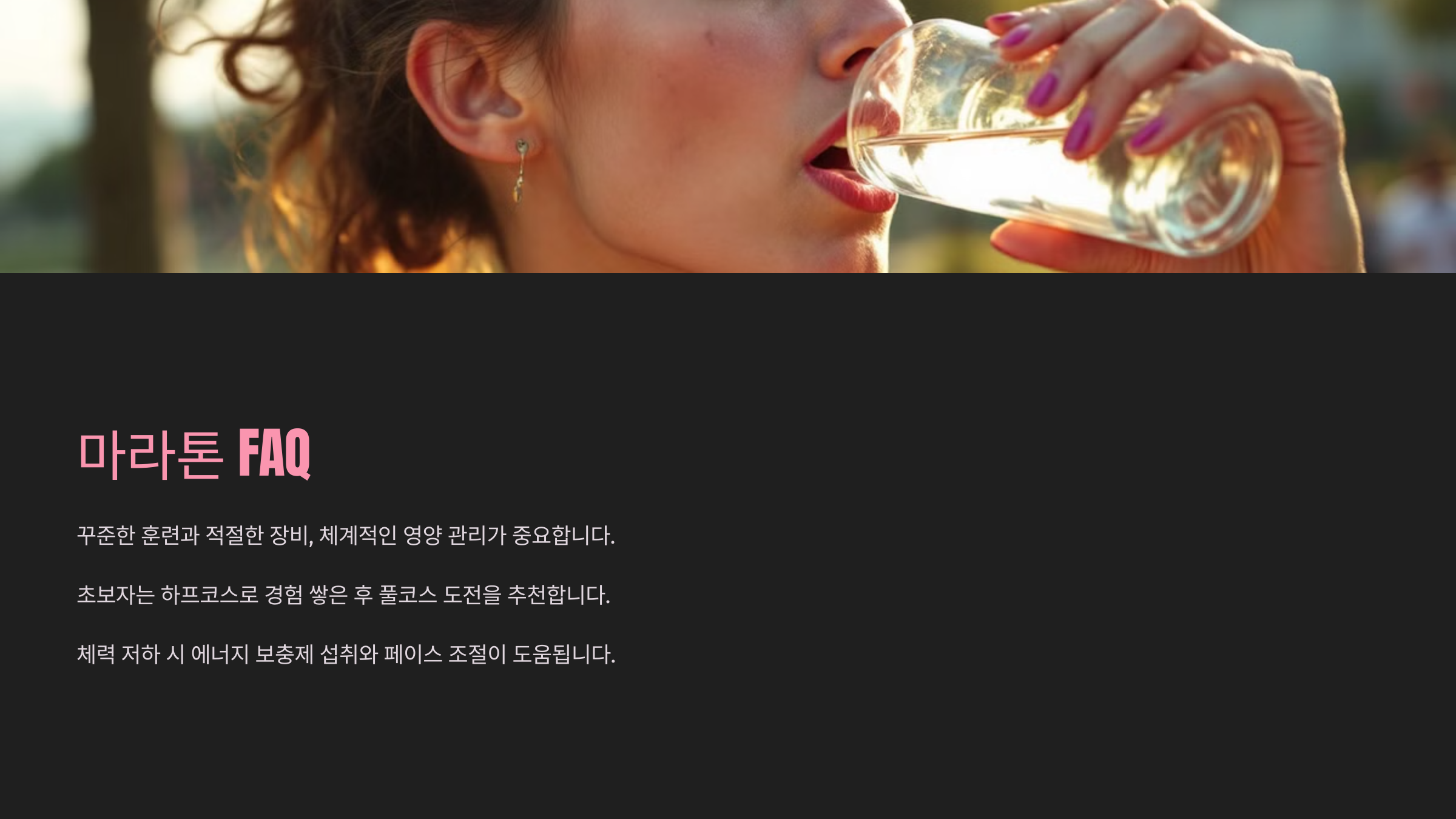 초보자라면 하프코스를 통해 경험을 쌓은 후 풀코스에 도전하는 것을 추천합니다. 자신의 체력과 목표에 맞게 결정하세요. - 마라톤 도중 체력이 떨어지면 어떻게 해야 하나요?