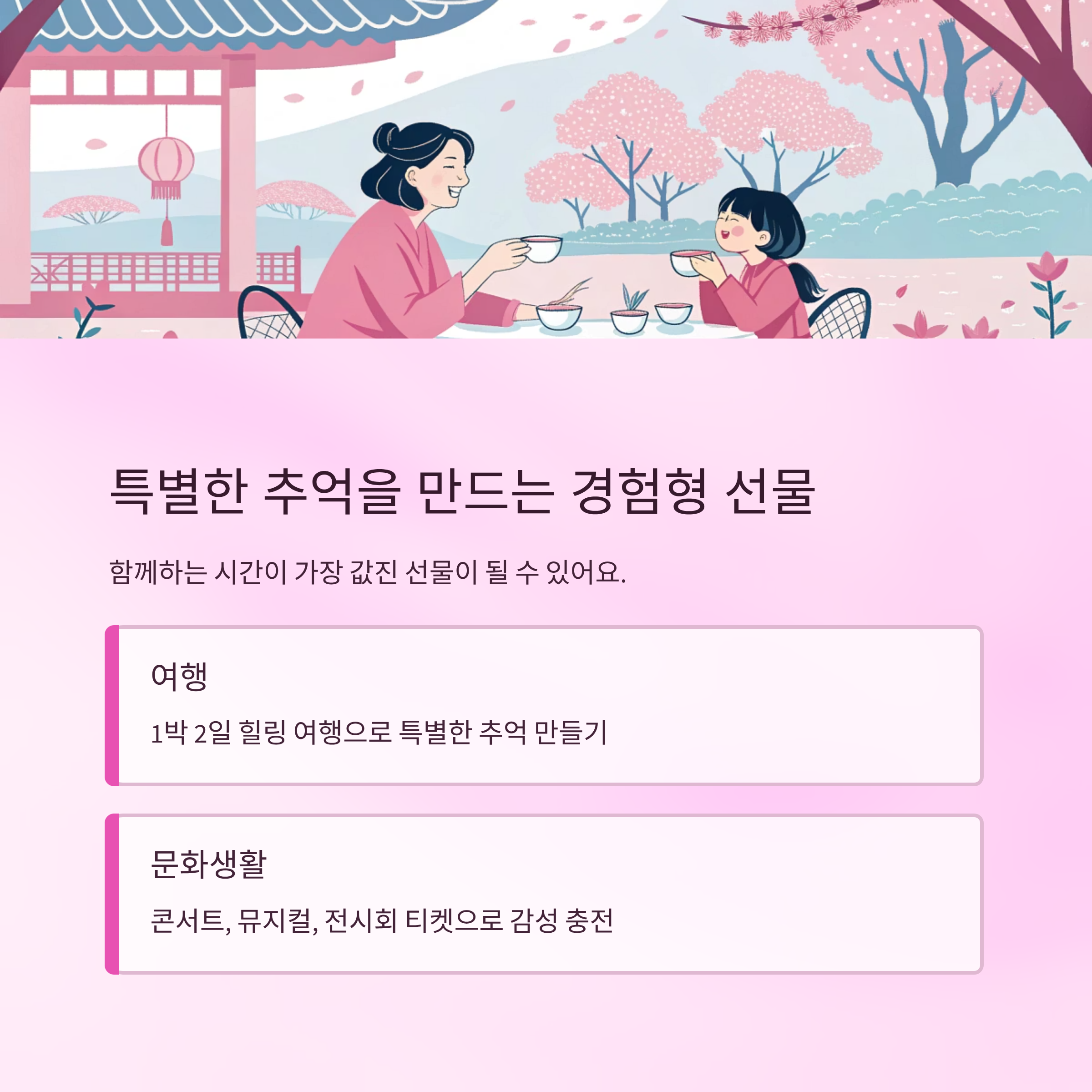 고급스러운 선물은 엄마의 일상에 기분 좋은 자극을 줘요. 너무 비싼 게 부담스러우면, 품격 있는 가성비 아이템으로도 충분히 감동을 전할 수 있답니다. 다음은 엄마와의 특별한 추억을 만들어주는 경험형 선물 추천이에요! 🧳